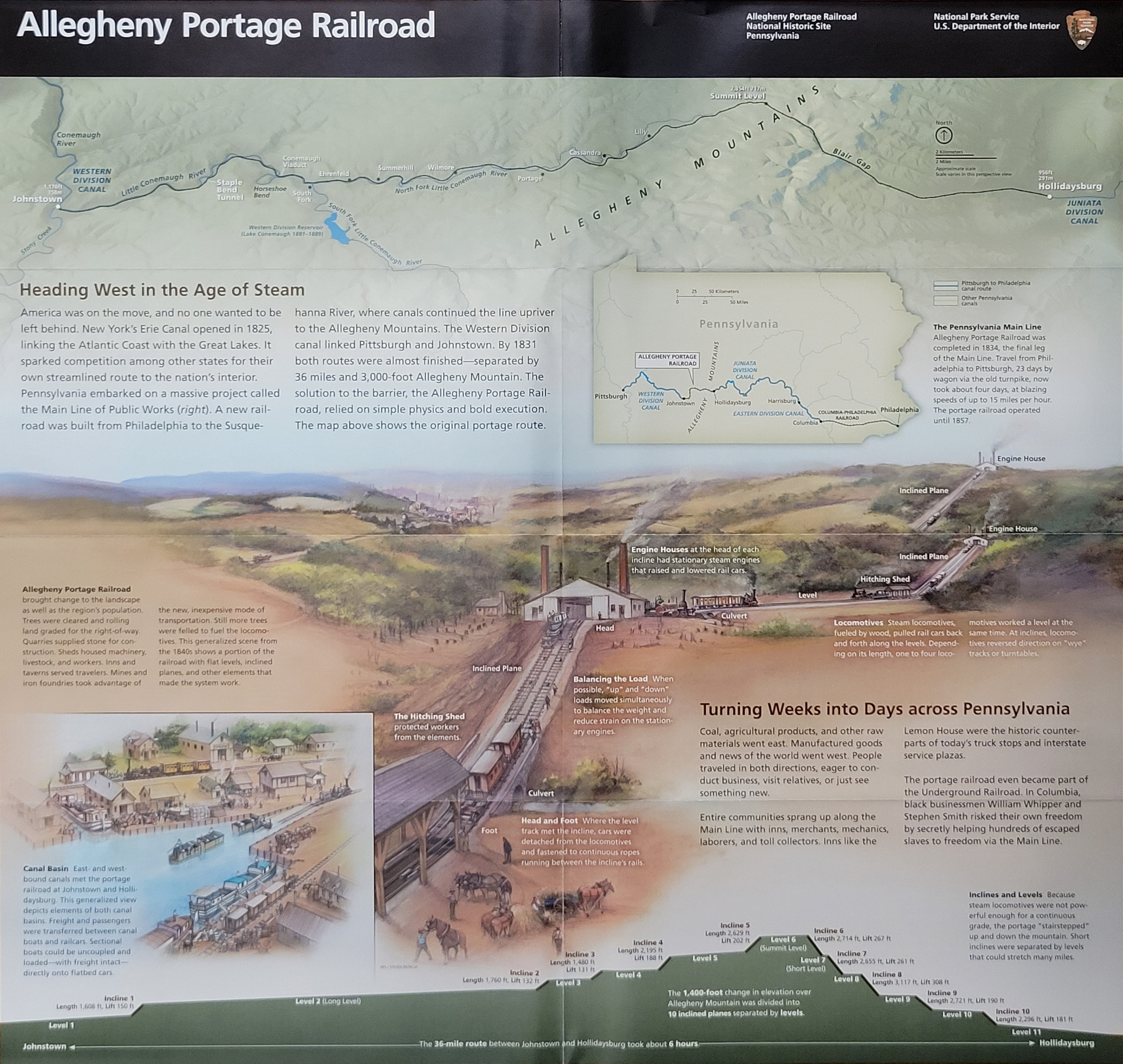 여기 6번 엔진하우스의 고도가 전구간에서 가장 높은 해발 717 m이고, 사진의 서쪽 방향으로 완만한 서밋레벨(Summit Level)을 지나 1~5번의 경사로를 내려가서 해발 358 m의 존스타운에서 기차에 실린 배를 다시 운하에 내렸던 것이다. 여기서 반대편 동쪽 방향으로 10번 엔진하우스 자리까지 국립 공원으로 지정되어 있으며, 그 쪽으로 철도가 끝나는 홀리데이스버그(Holidaysburg) 마을은 291 m로 거리는 훨씬 가깝지만 고도차는 더 크다.