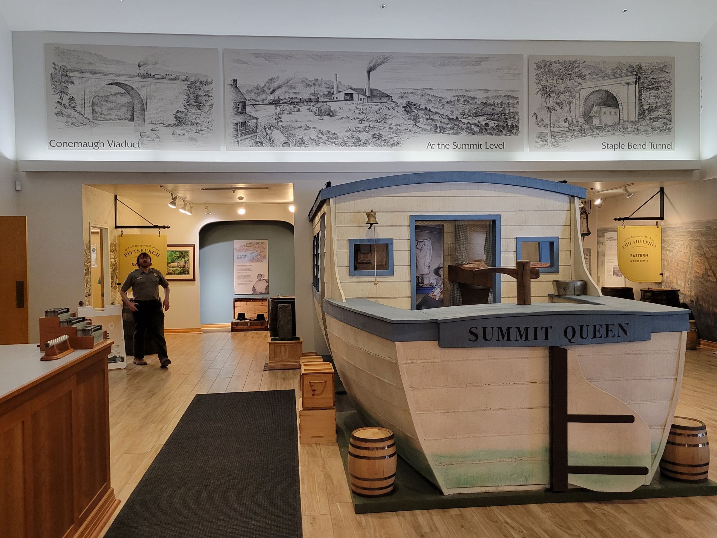 복선 철도를 덮고 건설된 저 커다란 하얀 건물인 '엔진 하우스(Engine House)'에 있다. 브로셔 사진 제일 아래에 이 노선의 고도 변화를 보여주는 단면도가 있는데, 배를 실은 무거운 기차가 산을 넘기 위해서는 10곳의 경사로마다 이런 엔진실을 만들어서 열차를 밧줄로 잡아 당겨야 했던 것이다!