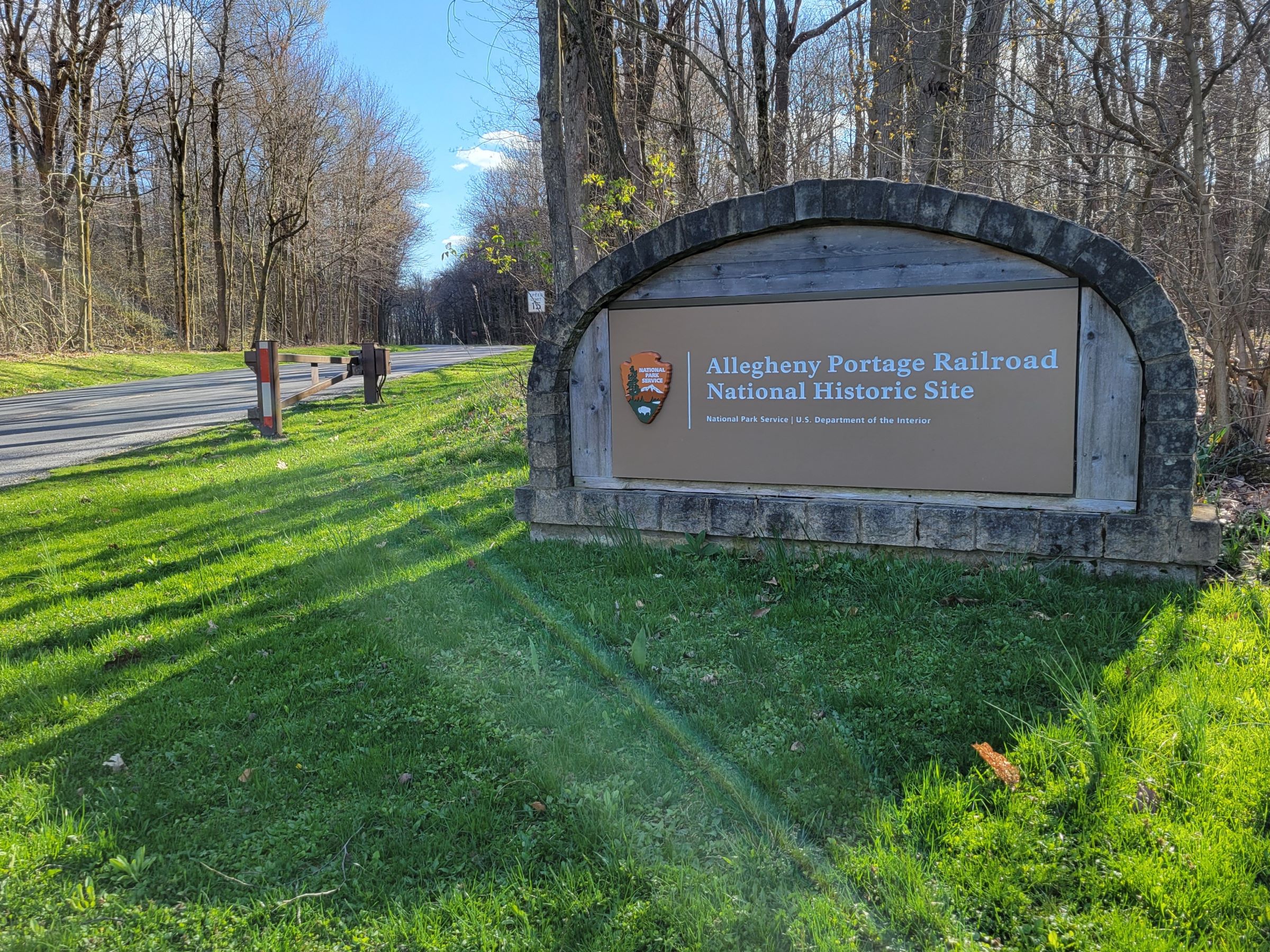 혼자 하루에 10시간 동안 차를 몰고 6곳의 목적지를 찾아다녔던, 지난 4월말의 '펜실베이니아 별볼일 없는 국립 공원들' 시리즈의 마지막 편이다. 해질녘 긴 그림자를 드리우고 있어 첫인상은 얼핏 묘비처럼 보이기도 했던 아래 사진의 공원 간판에는, 앨러게니 포티지 레일로드 국립사적지(Allegheny Portage Railroad National Historic Site)라 씌여 있으니까 기차(train)와 관련된 장소임을 알 수 있었다. 그렇다면 저 테두리의 돌로 만든 아치는 철도가 지나가는 다리의 교각이나 터널의 형상을 나타내고자 했던 것 같다.