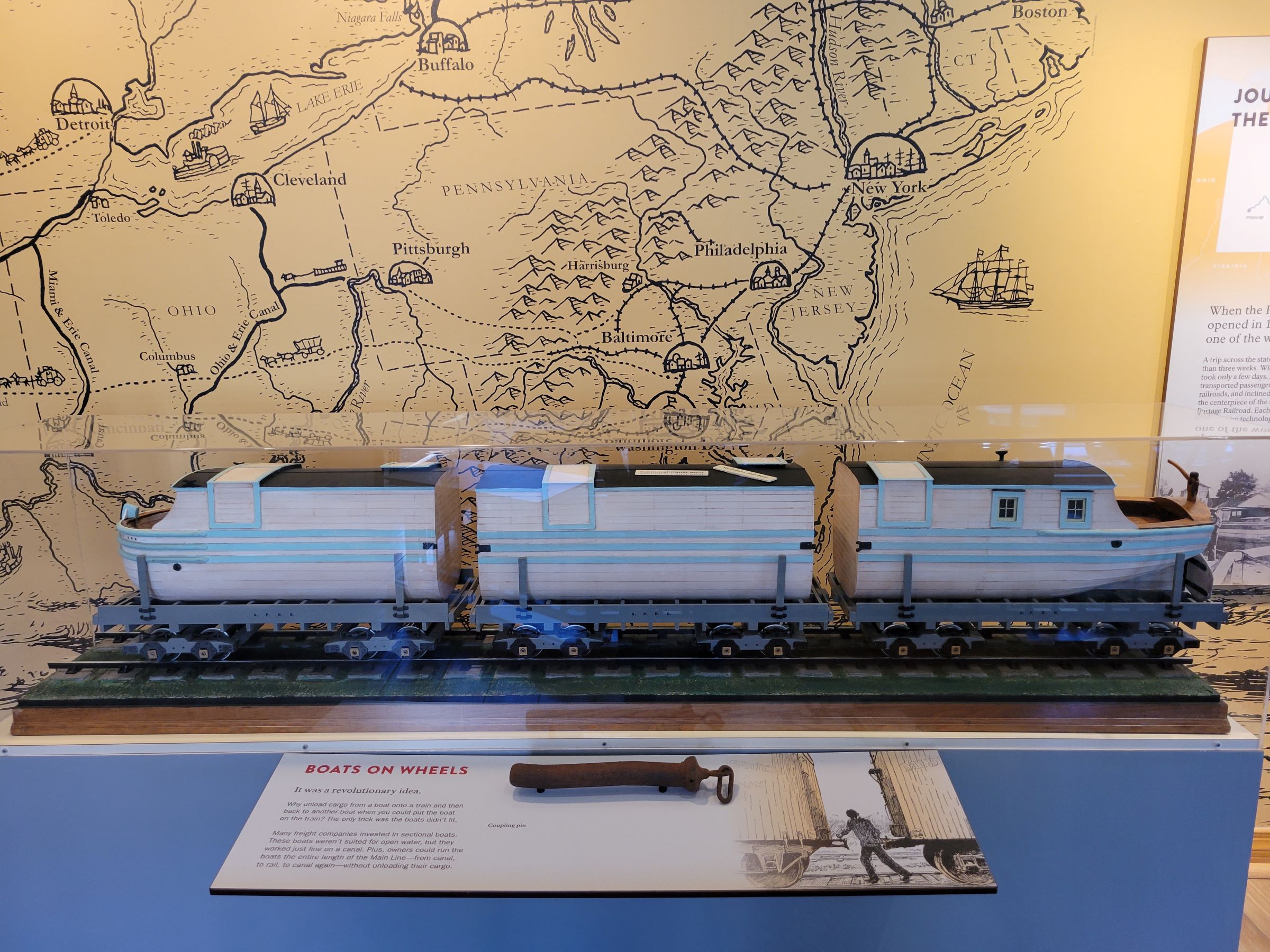 1830년대는 증기기관(steam engine)을 이용한 철도가 건설되기 시작했지만, 대량의 물류운송은 아직도 운하(canal)가 효율적이던 시기였다. 1사분면의 펜실베니아 지도와 같이 필라델피아와 피츠버그를 운하로 바로 연결하는 것은 높은 앨러게니 산맥(Allegheny Mountain)에 가로막혀 불가능하니까, 거기 블레어 고개(Blair Gap)를 넘는 36마일 구간은 운하를 다니는 배를 통째로 차량에 실어서 철도로 산을 넘도록 만든게 1834년에 개통된 Allegheny Portage Railroad란다. (두 수로 사이의 구간을 육로 운송하는 행위가 '포티지(portage)'라는 단어의 뜻)