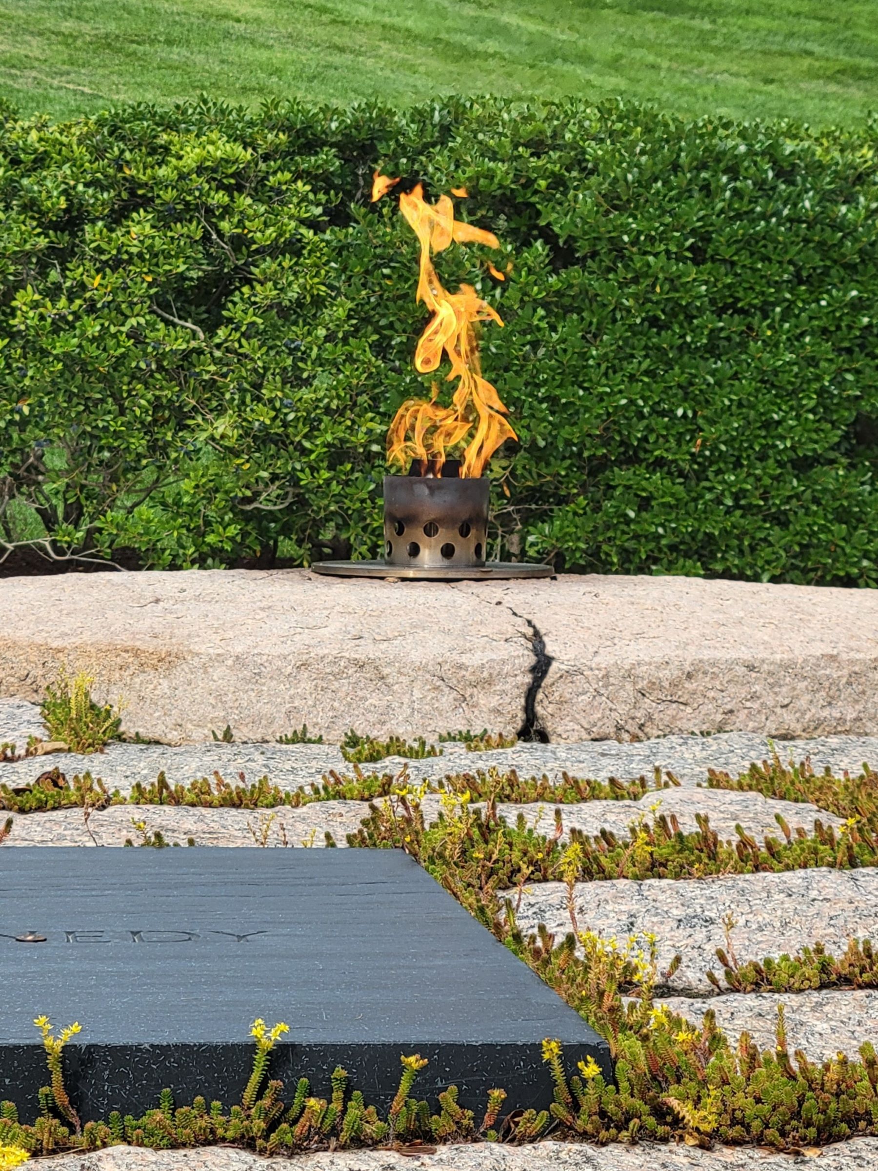 재클린의 아이디어로 급히 만들어져 암살 3일 후에 진행되었던 국장에서 그녀가 불을 붙였다는 '영원의 불꽃(Eternal Flame)'은 위치를 옮겨서 지금도 활활 타오르며 알링턴 국립묘지를 상징하는 역할을 하고 있다. 원래 무덤은 약간 위쪽의 언덕에 작게 만들어졌었는데, 전세계에 생중계가 되었던 그의 장례식 이후에 매일 수 만명의 참배객들이 다녀가는 바람에, 4년 후인 1967년에 현재의 넓은 장소로 이장을 했기 때문이다.