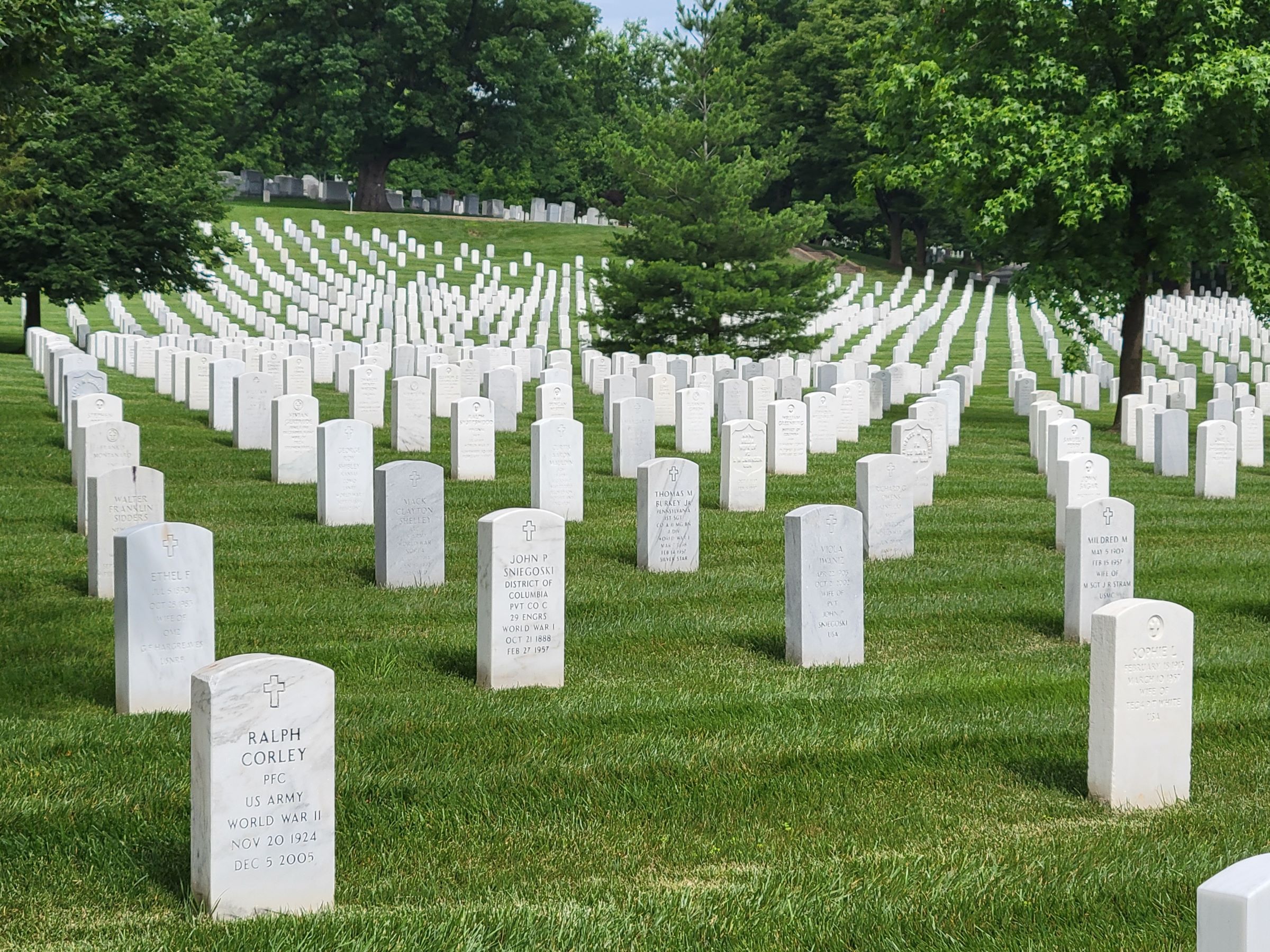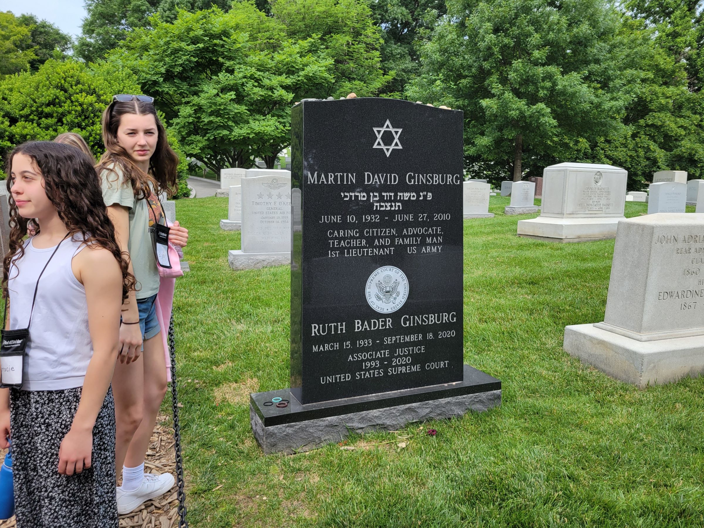 최근에 여기 묻힌 사람 중에서는 가장 유명하다고 할 수 있는, 2020년에 사망한 여성 대법관 루스 베이더 긴즈버그(Ruth Bader Ginsburg)의 묘비로, 육군에 복무했던 남편과 합장이 되어 있었다. 그녀는 'RBG'라는 애칭으로 불리며 일생이 다큐멘터리와 영화로 만들어지기도 했는데, 특히 참배객이 많은 것은 소녀들의 우상이었던 이유도 있지만, 가장 유명한 묘지의 가까이에 위치했기 때문이다.