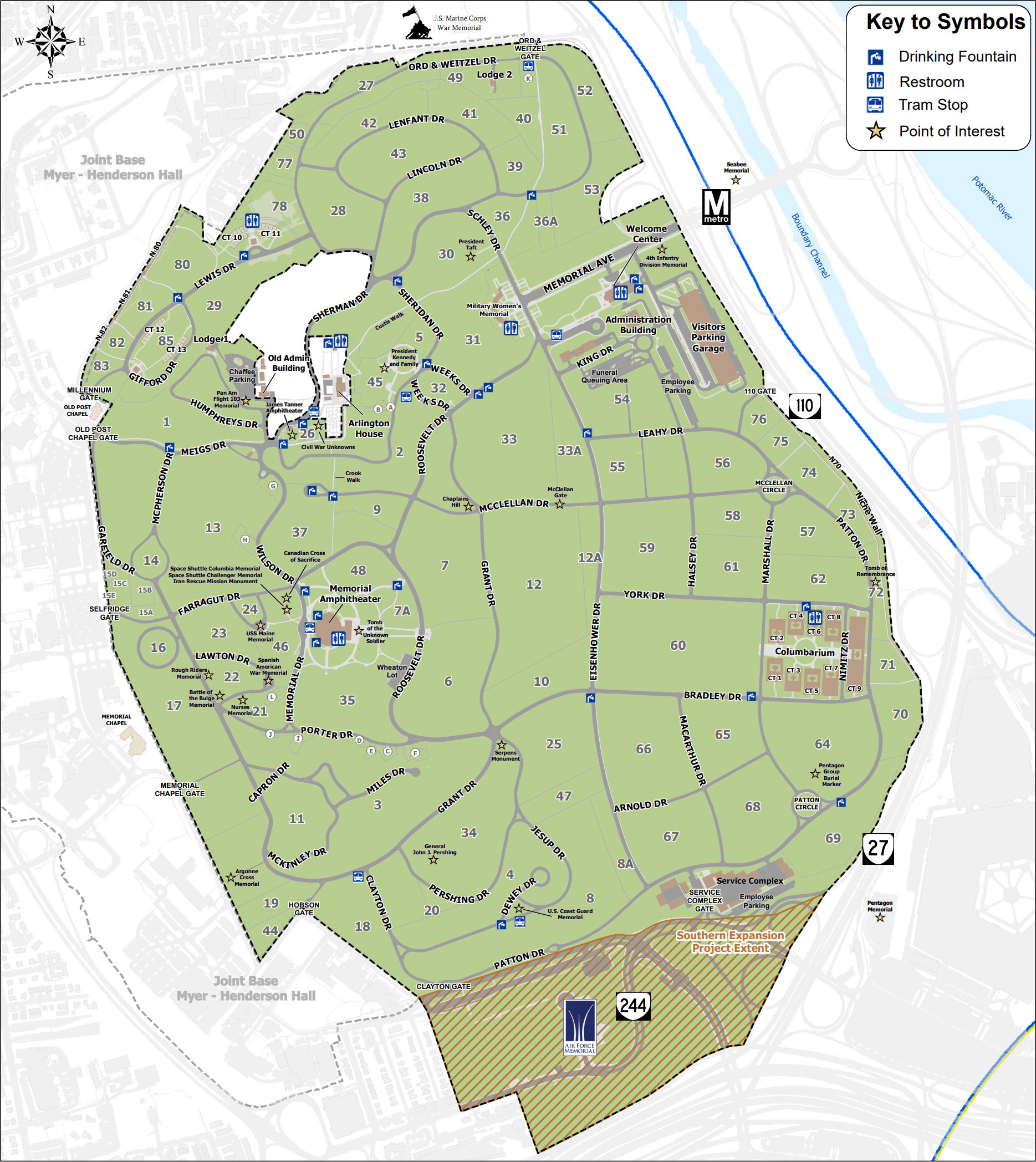 포토맥 강을 사이에 두고 워싱턴DC의 링컨 기념관과 마주보고 있는 버지니아 주의 알링턴 국립묘지 전체 지도로, 북쪽 끝에 표시된 유명한 미해병대 전쟁기념비(Marine Corps War Memorial)부터 동남쪽의 펜타곤 메모리얼과 함께 소개했던 제일 아래 미공군 기념물(Air Force Memorial)까지의 거리가 약 3km나 된다. 묘지 왼편을 Joint Base Myer–Henderson Hall 군기지가 감싸고 있는데, 현재 미국 전역의 164개 국립묘지들 중에서 최대인 알링턴은 군대가 직접 관리하는 딱 2곳중의 하나이다. (다른 1곳은 워싱턴DC 안에 있고, 게티스버그 등 국립 공원에 포함된 14곳은 국립공원청이, 나머지 148곳은 보훈부가 관리함)