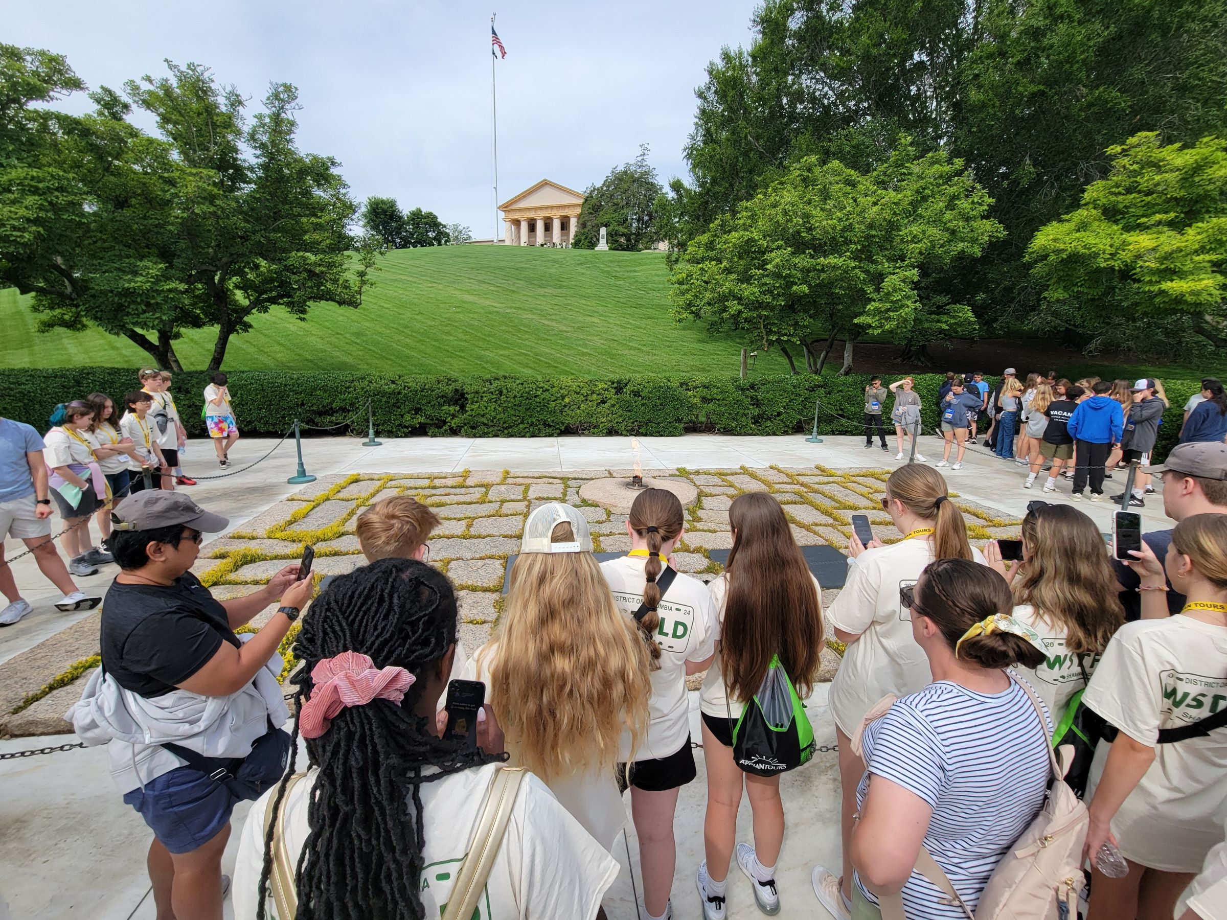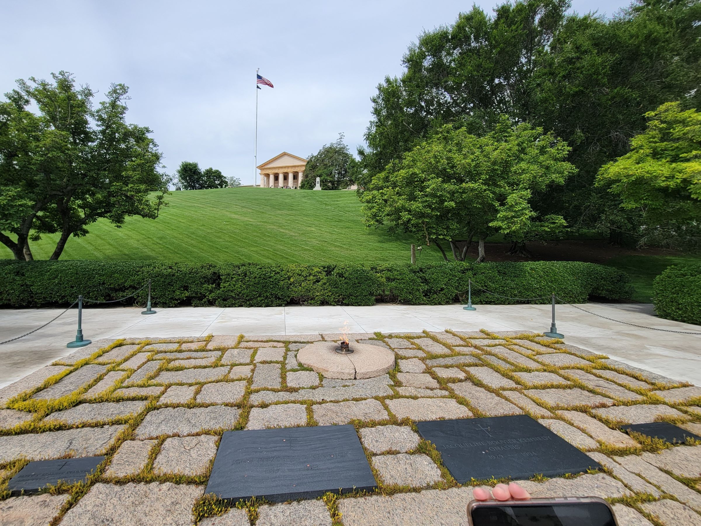 바로 알링턴 국립묘지를 방문한 사람이라면 빠지지 않고 들리는, 1963년 11월 22일에 텍사스에서 암살당한 제35대 존 F. 케네디(John Fitzgerald Kennedy) 대통령 묘소이다. 참고로 여기 매장된 역대 미국 대통령은 JFK를 포함해 딱 2명 뿐인데, 다른 한 명은 제27대 윌리엄 태프트(William Howard Taft)로 여군 기념관 북쪽에 묘소가 있다. (언덕 위에 보이는 그리스 신전 스타일의 건물은 '알링턴 하우스'로 이 곳의 역사와 함께 별도 포스팅으로 소개할 예정)