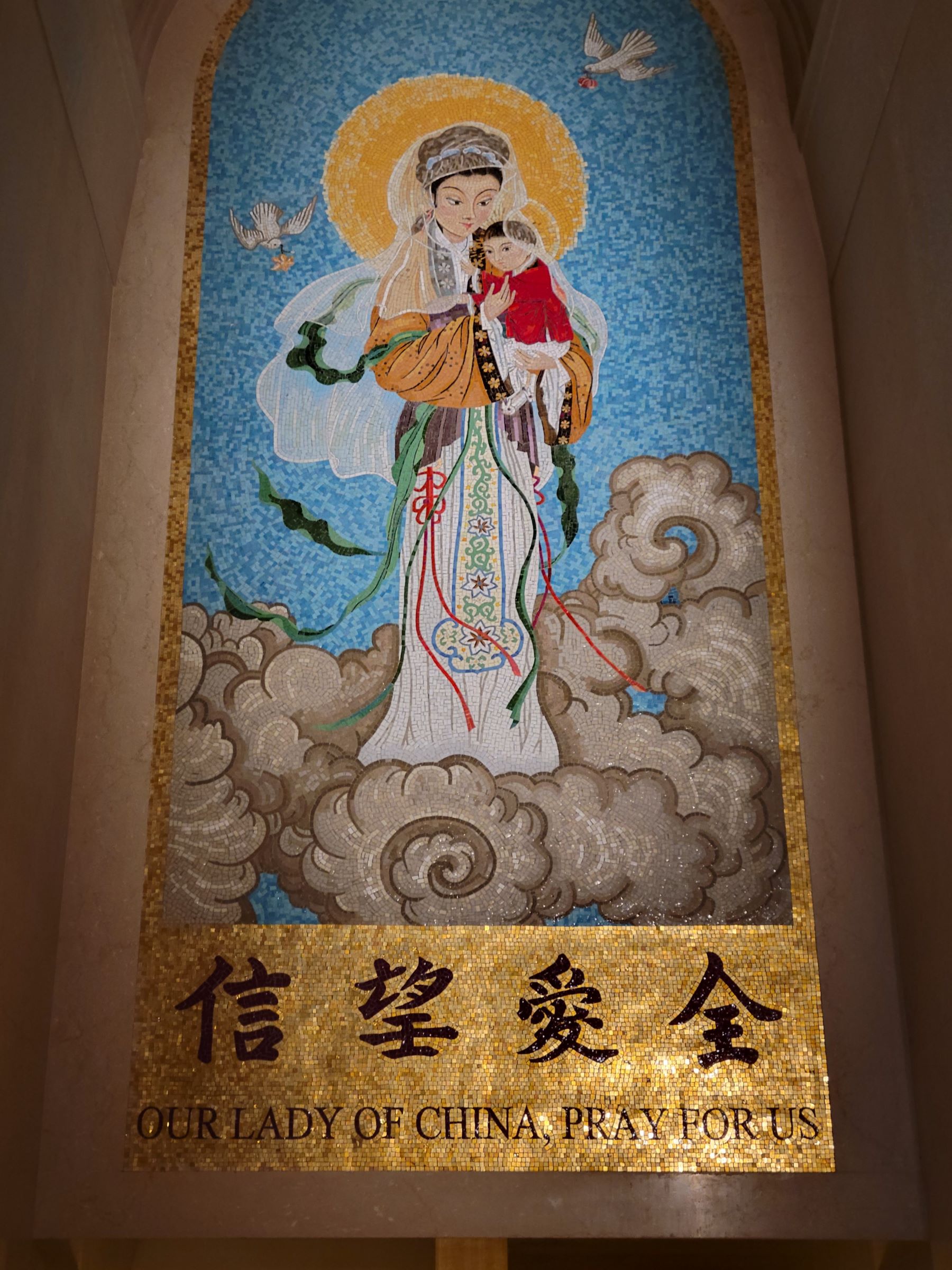 이렇게 한자와 함께 중국풍으로 만들어진 모자이크도 있었다. 성모상은 아니지만 입구쪽 벽에는 한국의 가톨릭 성인들을 묘사한 부조도 따로 만들어져 있다고 하지만, 방문 당시에는 몰라서 찾아보지는 못했다.