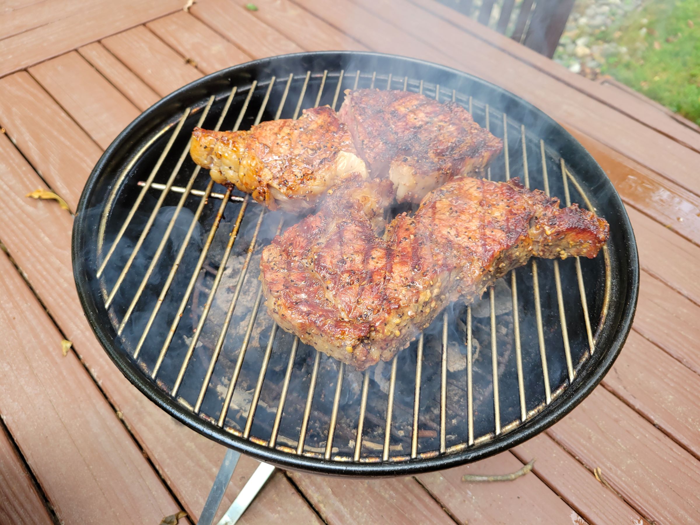 PS. 독립기념일에는 조촐하게 미국의 생일을 축하하는 의미로, 앞서 언급한 냉동실에 초장기로 보관되어 있던 두꺼운 스테이크를 꺼내서 오후 소나기에도 불구하고 아래와 같이 그릴에 숯불로 구워서 먹었습니다.