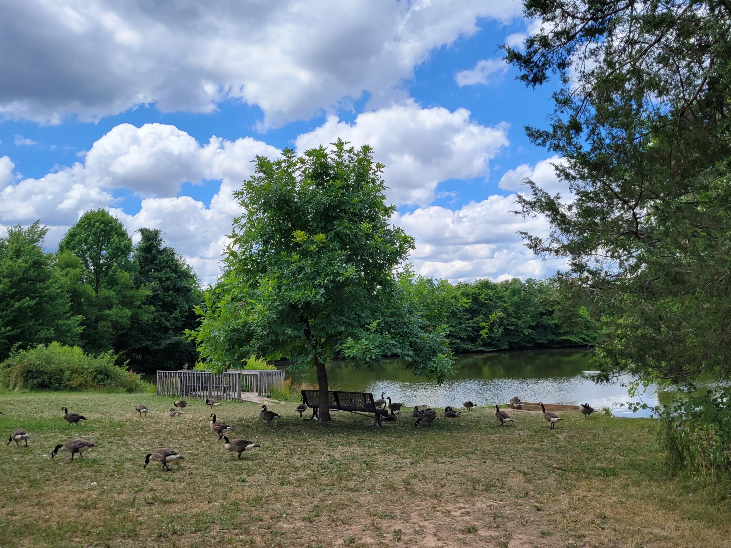 그렇게 식사를 마치고 조금 안쪽으로 걸어 들어가니, 그 오리들이 떼거지로 몰려있는 작은 연못이 나왔다. 지도에 표시된 이름이 프로그섀클 폰드(Frogshackle Pond)로 직역하면 '개구리 족쇄'라는 참 특이한 뜻이다. 물가에 만들어 놓는 전망대까지 가보고 싶었지만, 많은 수의 오리들이 무섭기도 하고, 풀밭에 저 분들의 배설물로 추정되는 물체들이 너무 많아서 후퇴~