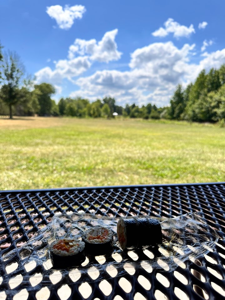 하지만 이 날 우리의 점심 메뉴는 김밥! 전날 저녁으로 싸서 먹고 남은 것을, 마침 둘 다 쉬는 날이라 꼭 밖에서 먹기로 하고, 고른 장소가 여기였던 것이다. 재료도 빠진게 많은 '냉파' 김밥 4줄을 각각 랩으로 싸와서 사진은 볼품이 없지만, 이런 풍경을 전세낸 나들이에서 먹는 김밥이 맛이 없을 수가 없었다.