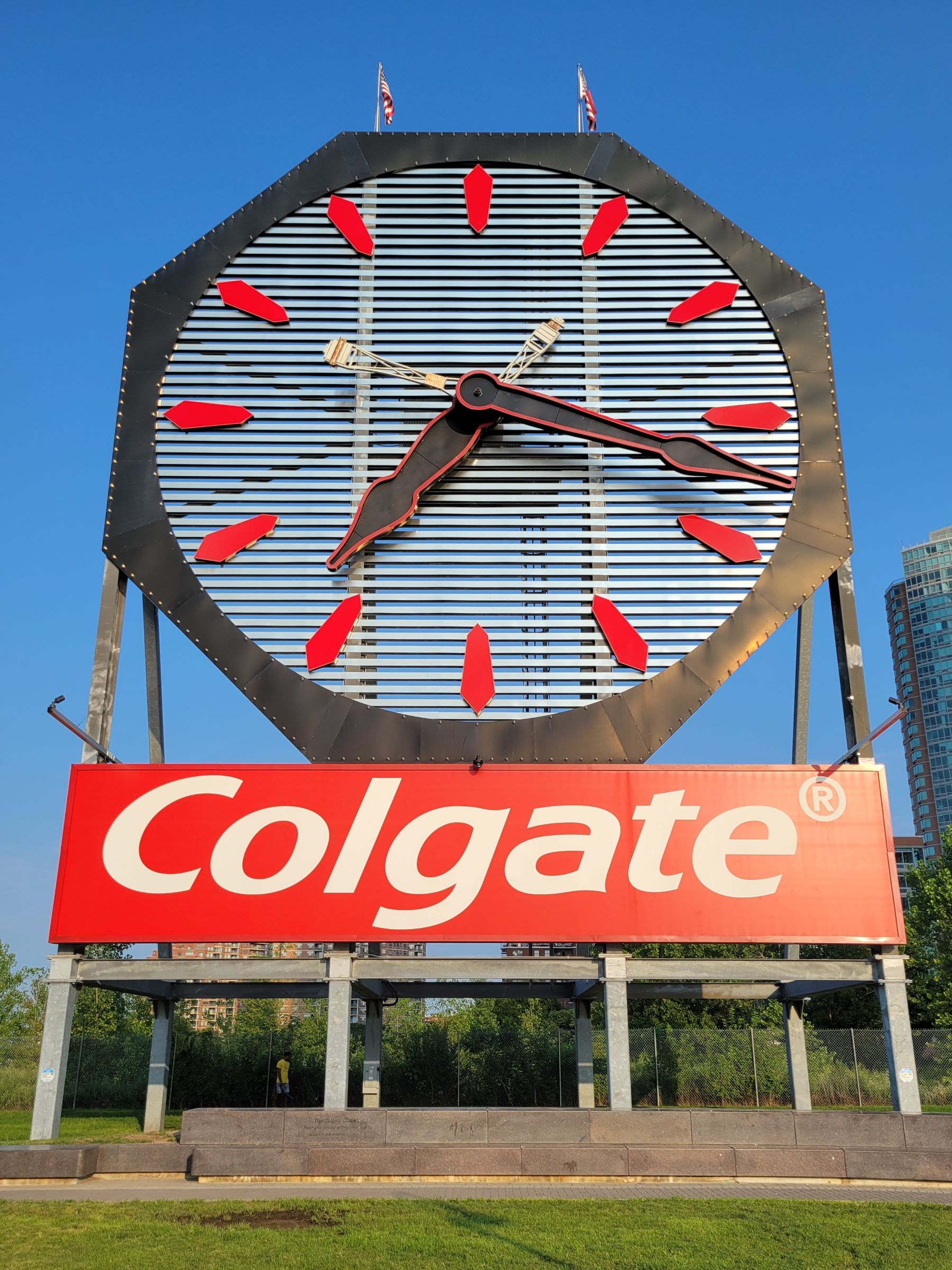 조금 전 지나왔던 골드만삭스 빌딩이 있던 자리에 생활용품 회사인 콜게이트-팜올리브(Colgate-Palmolive)의 공장단지가 있었는데, 그 중 본사 건물 옥상에 1906년에 최초로 커다란 시계가 만들어지고, 1924년에 지금의 시계로 바뀌어서 광고판 역할을 했단다. 그러나 1980년대에 재개발이 되면서 건물은 모두 철거되고 시계는 공터에 그냥 보관이 되다가, 2000년대에 들어서 다시 작동 가능하도록 수리가 되었고 2013년에 LED 조명 등으로 완전히 업그레이드를 해서 현재의 위치에 설치가 되었단다.
