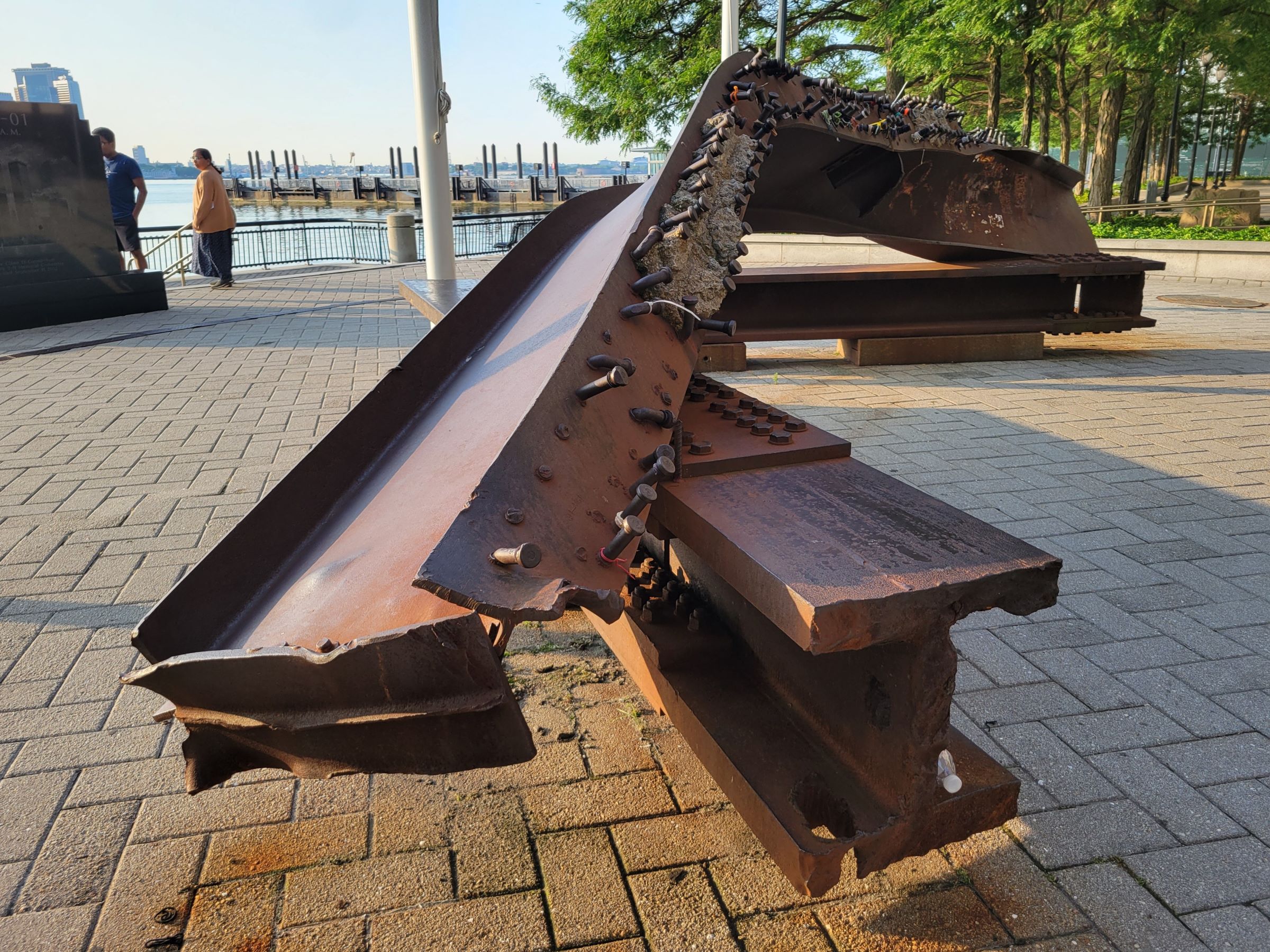 2018년까지는 뉴저지 주에서 가장 높은 빌딩이었고, 지금도 2위를 기록하고 있는 238미터(42층)의 골드만삭스 타워(Goldman Sachs Tower)를 배경으로, 한 가족이 보고있는 까만 석판과 구부러진 녹슨 철근 및 하얀 헬멧을 쓰고 난간에 걸터앉은 인물의 조각상이 보인다.