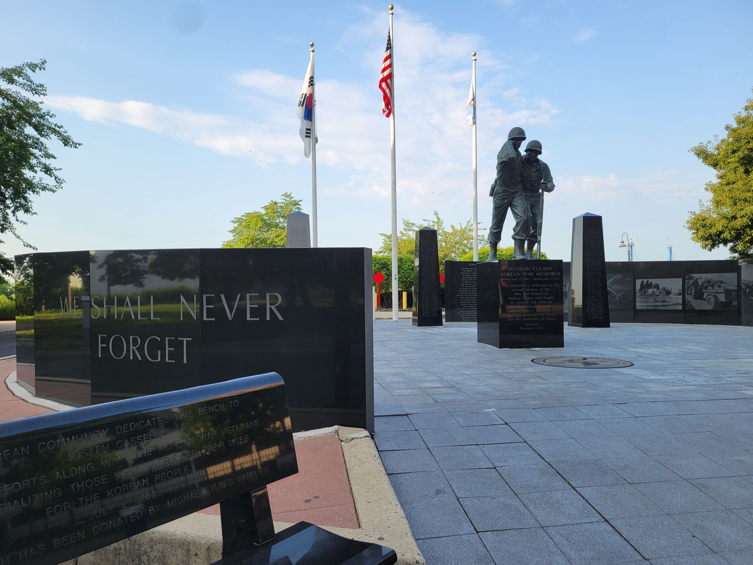 태극기가 펄럭이는 허드슨 카운티(Hudson County)의 한국전 참전용사 기념물은 2002년에 이 자리에 만들어졌는데, 이 지역 출신으로 한국전에서 사망한 126명과 다른 많은 부상자들을 기리는 공간이다. 지난 3월에도 여기처럼 지자체에서 만든 집 근처의 작은 한국전 기념관을 짧게 소개한 적이 있었는데, 이러한 장소들을 방문하면 참 고마운 느낌이 들어서 짧게나마 감사의 시간을 혼자 가진다.