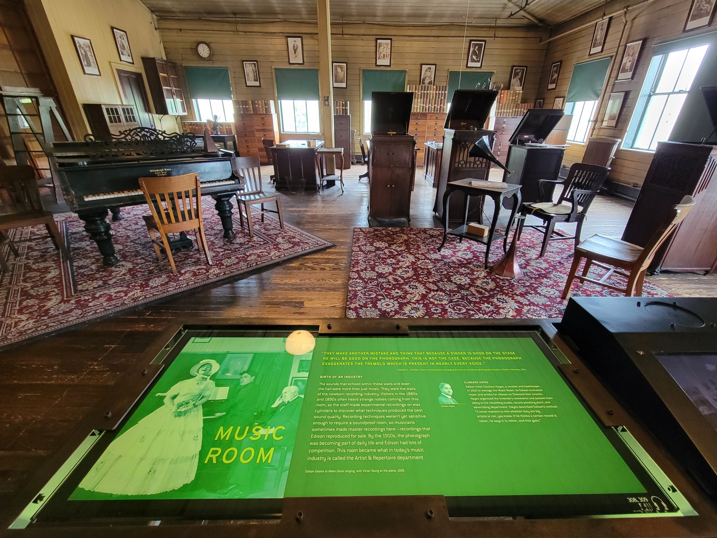 3층 끝에는 뮤직룸이 있어서 에디슨이 자신의 축음기로 녹음을 했던 피아노 등이 그대로 남아있다. 또 영사기 등도 발명을 해서 전세계 최초의 영화 스튜디로로 사용된 암실인 '블랙마리아(Black Maria)'가 비지터센터 뒤쪽에 남아 있으며, 결과적으로 음반과 영상의 대중예술 발전에도 큰 기여를 한 동시에 엄청난 영향력을 행사했다.