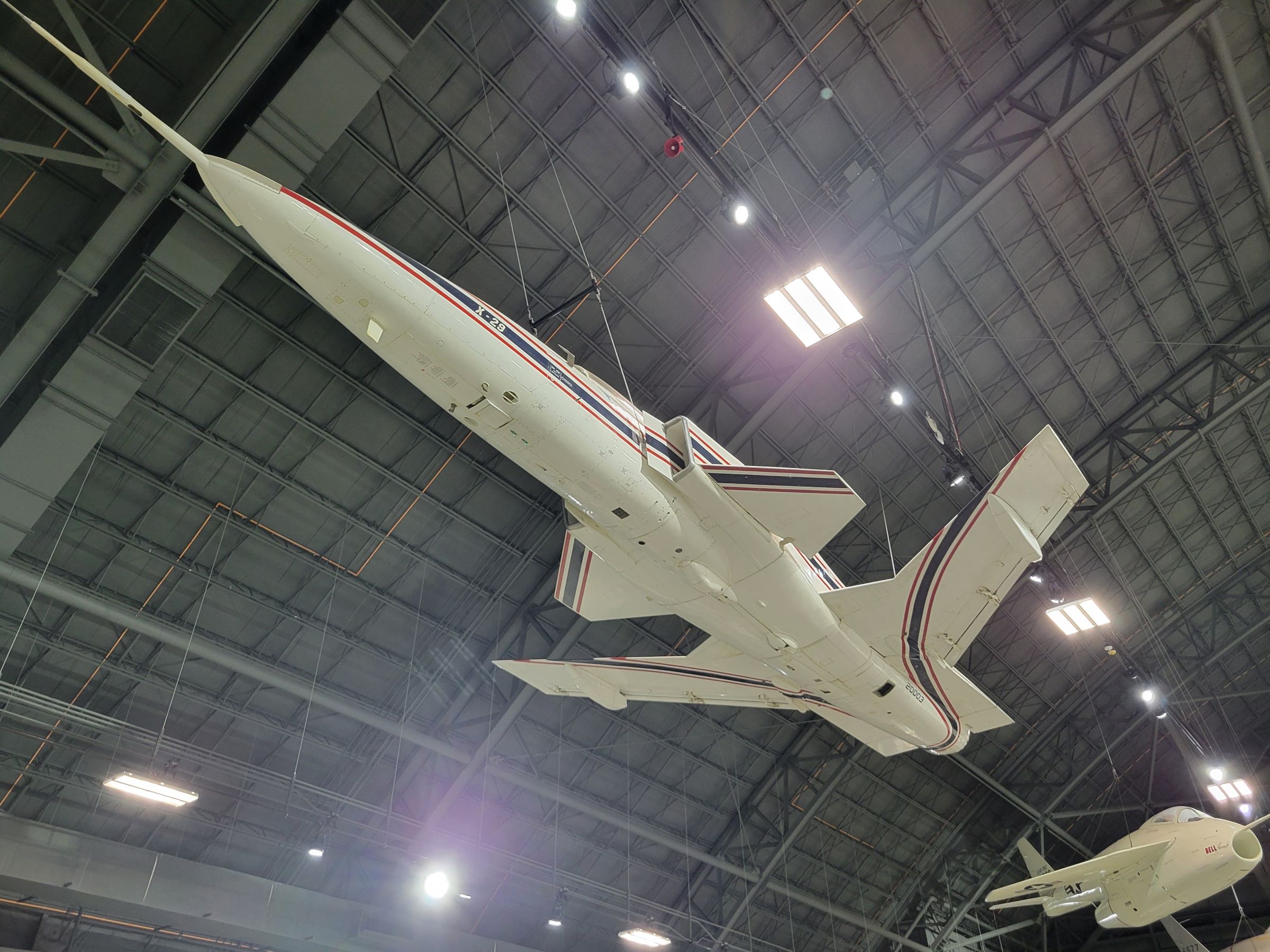 특이하게 앞쪽으로 꺽인 전진익 설계의 그루먼(Grumman) X-29 실험기는 날개를 잘 볼 수 있도록 공중에 메달려 있었다.