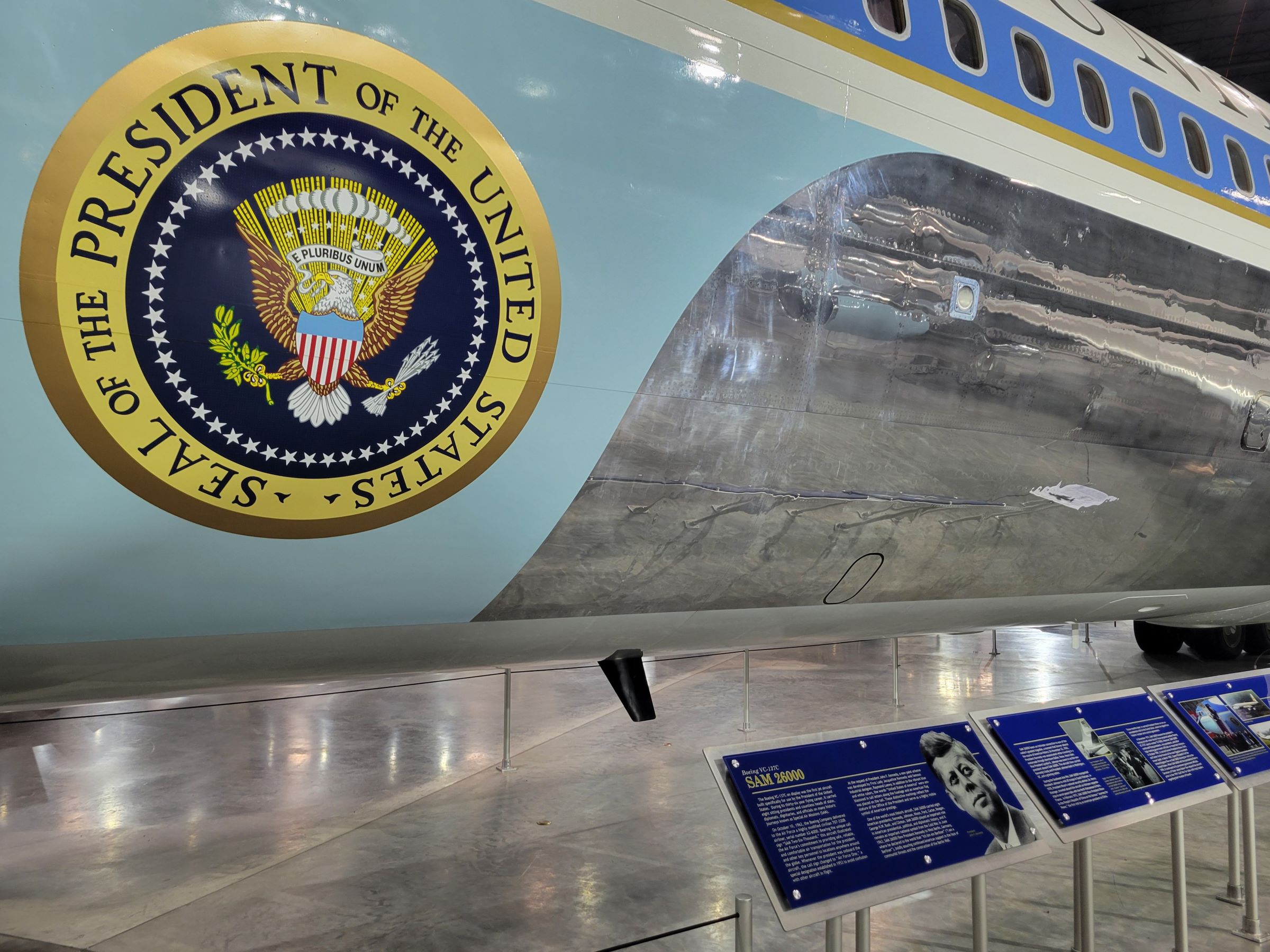보잉 707 여객기를 개조해서 SAM 26000으로 불리며 1962년부터 대통령 전용기 '에어포스원(Air Force One)'으로 운영되었던 VC-137C 비행기가 전시되어 있다. 같은 기종으로 10년 후에 도입했던 꼬리번호 27000의 후속기는 옛날에 방문했던 레이건 대통령 기념관에서 구경했었는데, 그 때는 내부사진은 절대 찍지 못하도록 했었다. 하지만 여기서는 19인치(약 50 cm)의 좁은 폭만 통과할 수 있으면, 내부를 얼마든지 자유롭게 구경하고 또 사진도 마음껏 찍을 수 있었다.