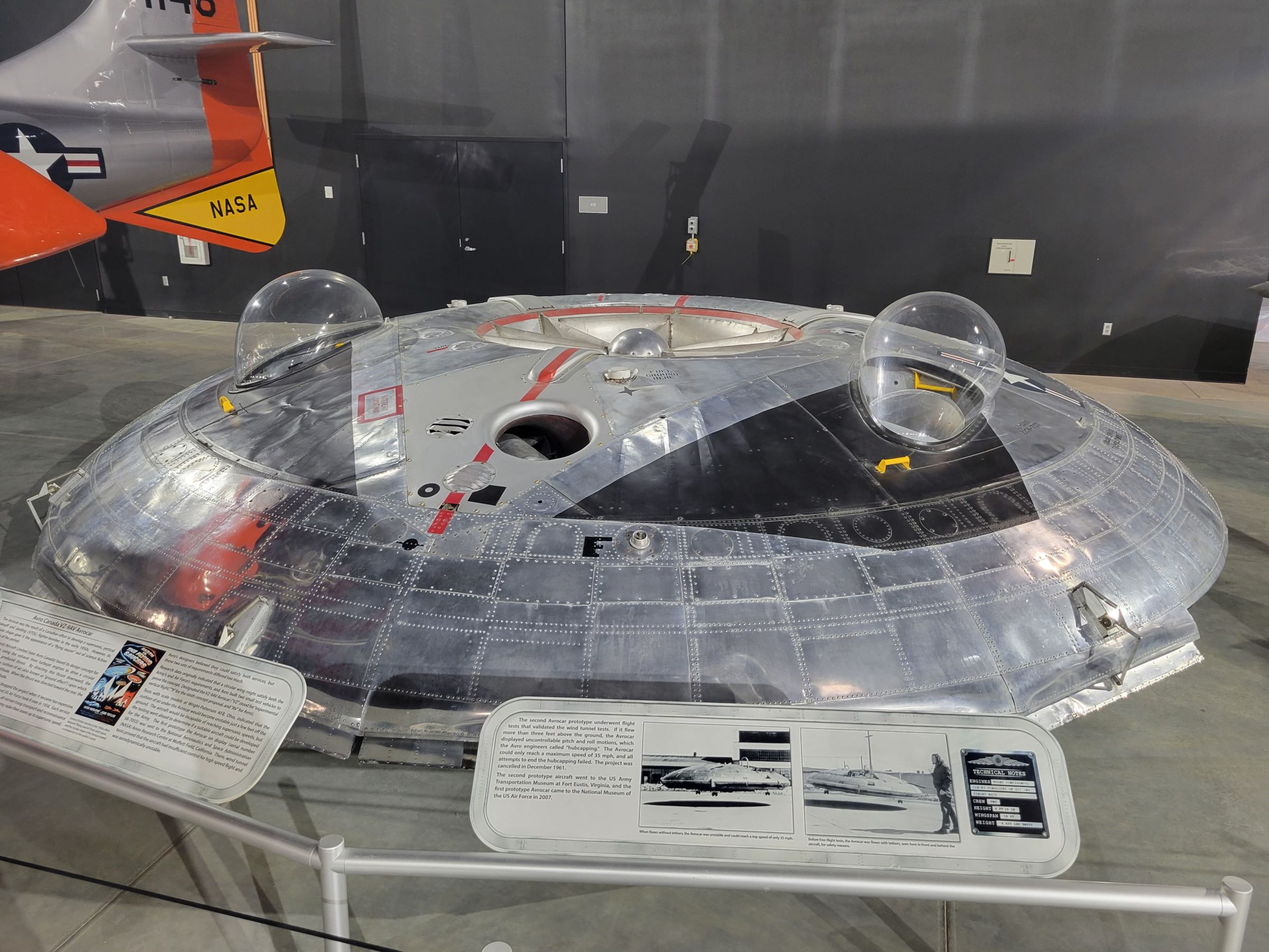 아주 재미있는 전시물로 1950년대말 캐나다 회사가 제작했다는 Avrocar라는 비행접시 모양의 수직 이착륙 테스트 기체가 있었다. 볼록한 비눗방울같은 곳에 두 명의 조종사가 머리를 내고 탑승을 했다는데, 제작된 두 대 중에서 여기 공군기지에서 실험을 했던 기체로 1961년에 땅에서 뜨는 것까지 겨우 성공했지만 너무 불안정해서 그 후로 계속 여기 창고에 처박혀 있었다고...ㅎㅎ