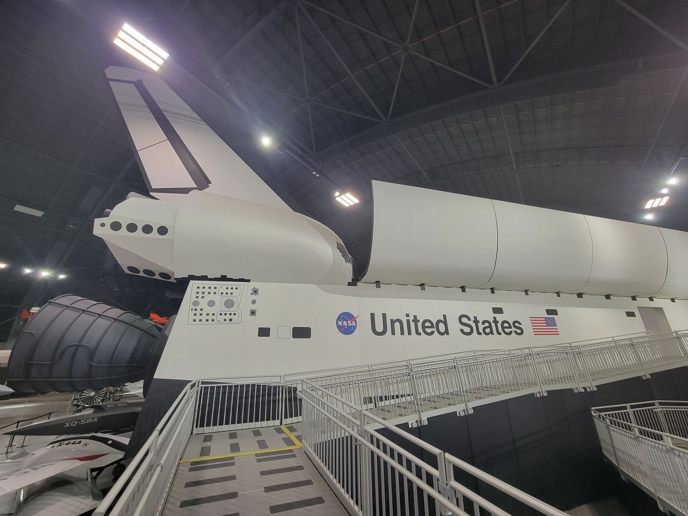 4번 격납고는 입구 위의 안내판과 같이 다양한 주제가 모여있는 전시실인데, 우측 R&D 갤러리(Research and Development Gallery) 방향을 알리는 표지판의 원 안에 그 비행기의 모습이 간단히 그려져 있고, 바로 아래쪽으로 멀리 미공군(U.S. Air Force) 글자가 씌여진 거대한 실물이 보인다.