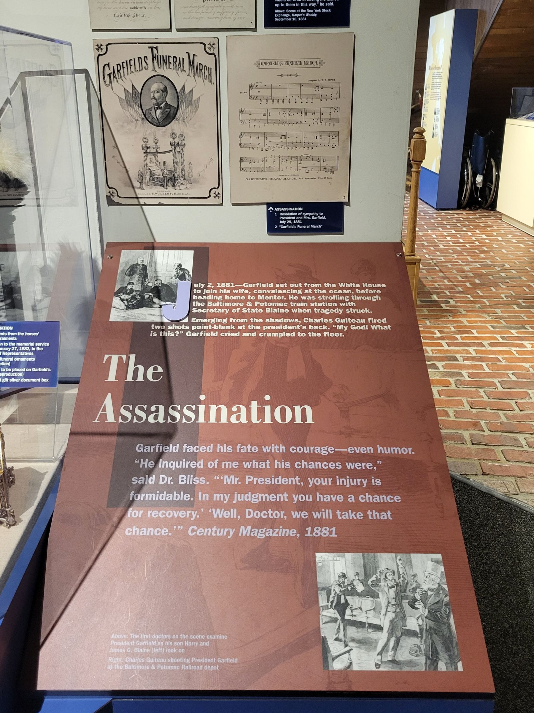 다음으로 대통령 선거와 취임식 등을 보여주는데, 제일 왼쪽에 빨간 옷을 맞춰 입은 사람들이 당시 선거운동원 모습이란다. 공화당 내 급진파였던 가필드는 선거자금이 부족했기 때문에, 다른 최대파벌의 지원을 받는 대신에 부통령 후보로 그쪽 계파 사람을 골랐고, 당선되면 상대 파벌에도 요직을 준다는 조건에 합의해야만 했다. 그 결과로 아주 근소한 차이로 대선에서 승리해서 1881년 3월에 대통령에 취임했지만...