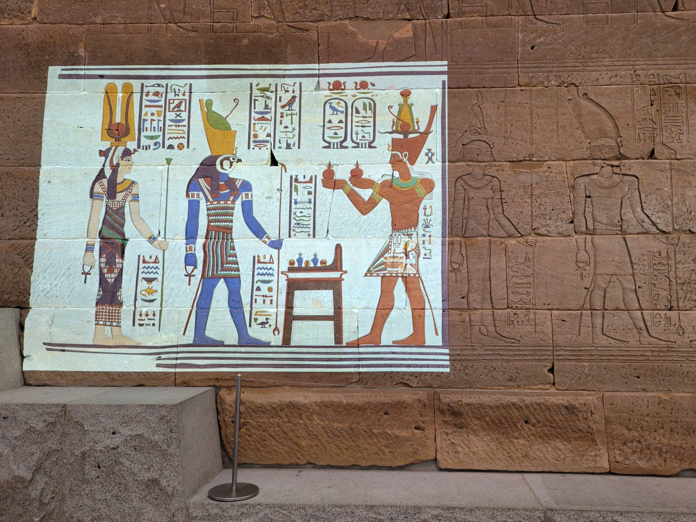 벽면에 프로젝터를 쏴서 이 신전이 만들어졌을 당시에 채색된 모습을 추정해 보여주는 것이 아주 흥미로웠다. 이번에 새로 알게된 사실은 이 그림에서 이집트 신들에게 술을 바치는 사람은 아우구스투스 황제로, 덴두르 신전은 고대 이집트 시대가 아니라 로마가 이집트를 정복한 후인 기원전 15년경에 두 건축양식이 혼합되어 만들어진 것이라고 한다.