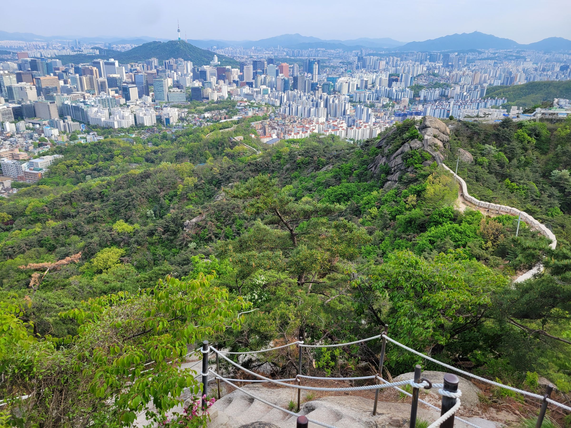 마지막 급경사는 따로 설치한 철제계단과 바위를 깍아서 만든 돌계단으로 올라야 했고, 정상에 거의 다 도착해서 뒤를 돌아보니 제법 험한 등산로가 발아래로 펼쳐져 보였다. 지하철을 타고 와서 이런 바위산을 오를 수 있다는 것과 또 등산로에서 외국인들을 많이 볼 수 있었던게 신기했다.