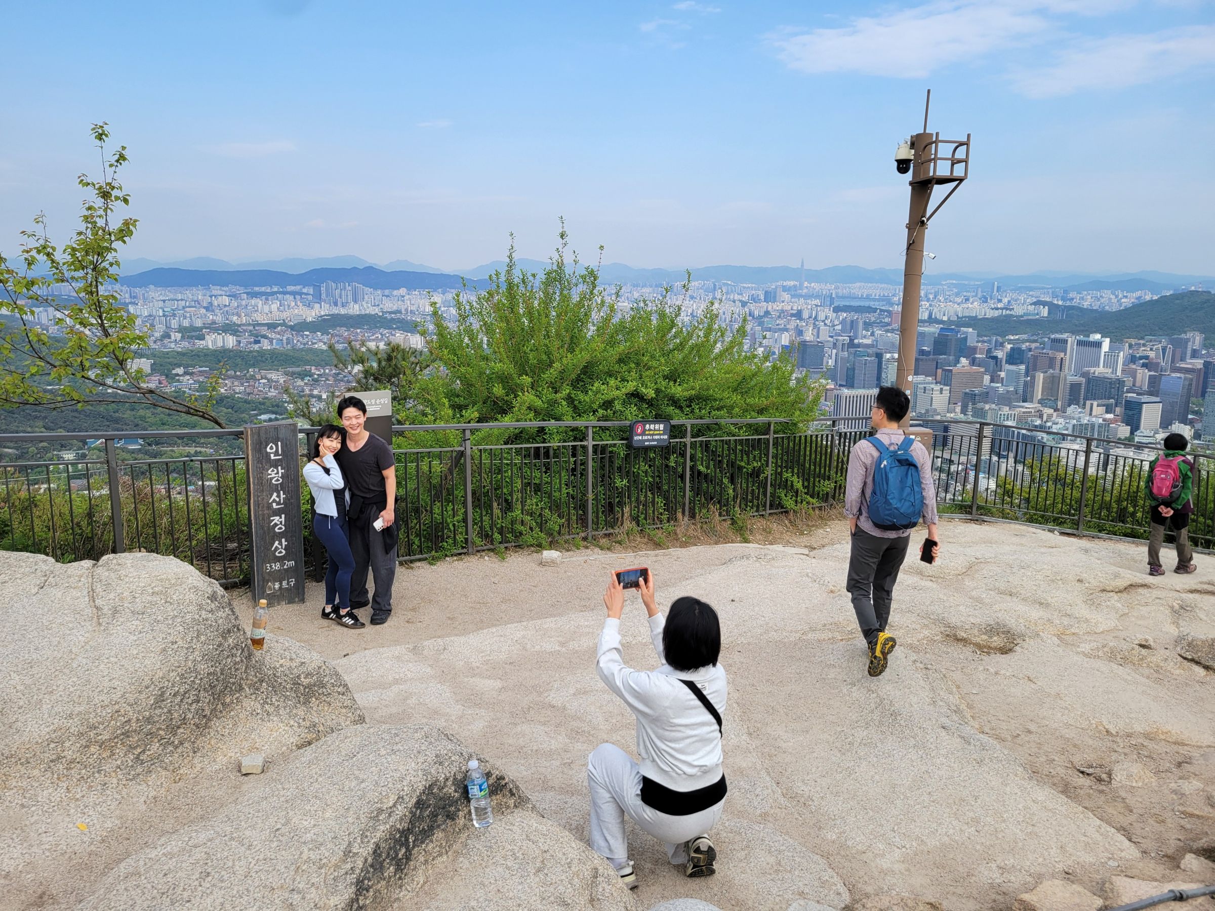 그렇게 지구 반대편에서 비행기를 타고 한국에 도착한 지 정확히 24시간만에 위기주부는 친구들과 해발 338.2미터의 인왕산 꼭대기에 올랐다! ㅎㅎ 정상 표식은 저기 세워져 있지만, 사진 왼쪽으로 보이는 바위가 가장 높은 지점이었다. 그래서 다른 사람이 내려오기를 기다렸다 올라가서는, 미국 LA에 살 때 동네 등산에서 자주하던 360도 비디오를 찍어봤다~