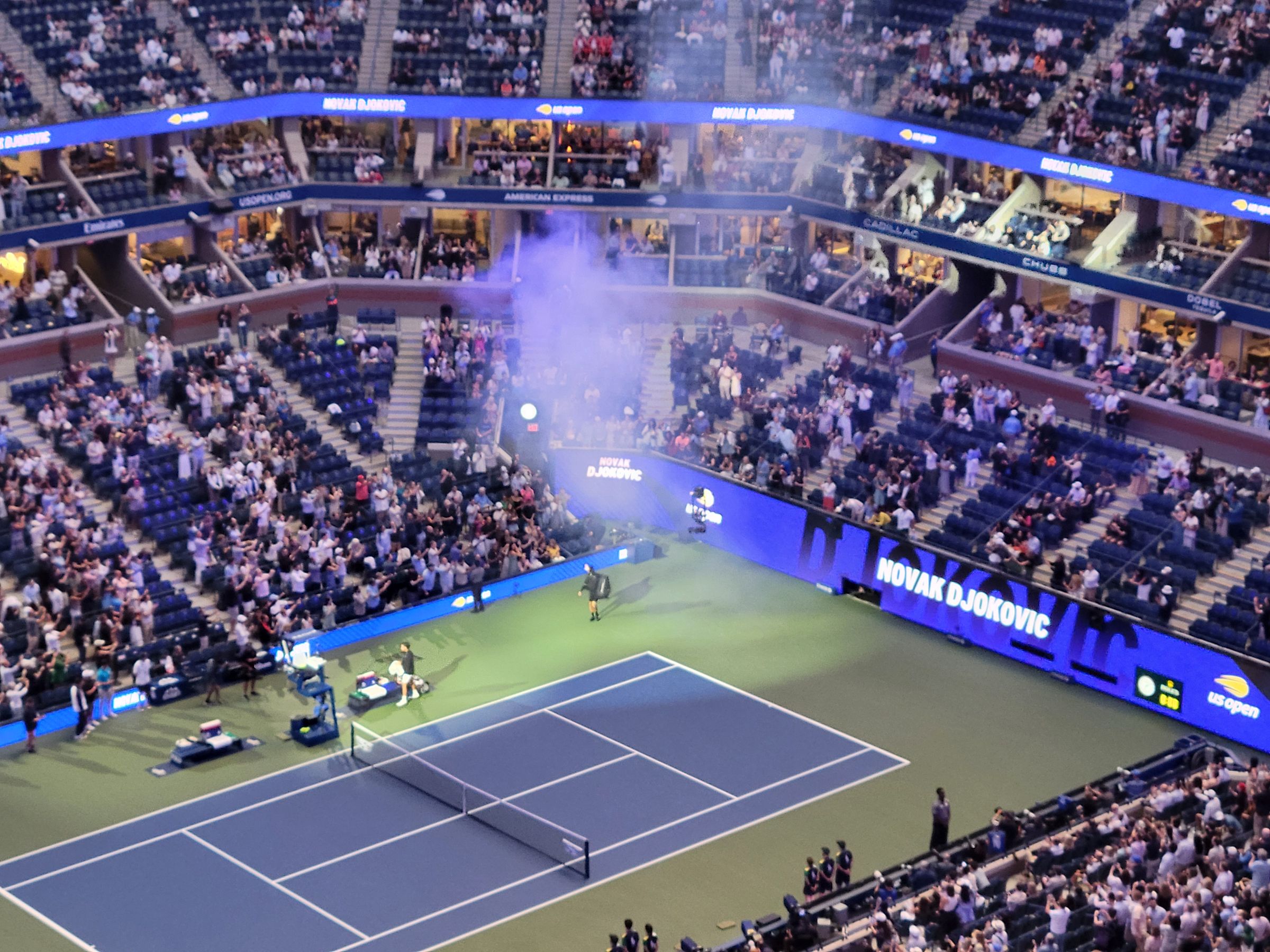 작은 폭죽과 함께 조코비치가 입장을 하며 손을 흔드는 모습이다. "내가 저 유명한 테니스 선수를 직접 보다니! 그런데, 좀 멀기는 하다..."