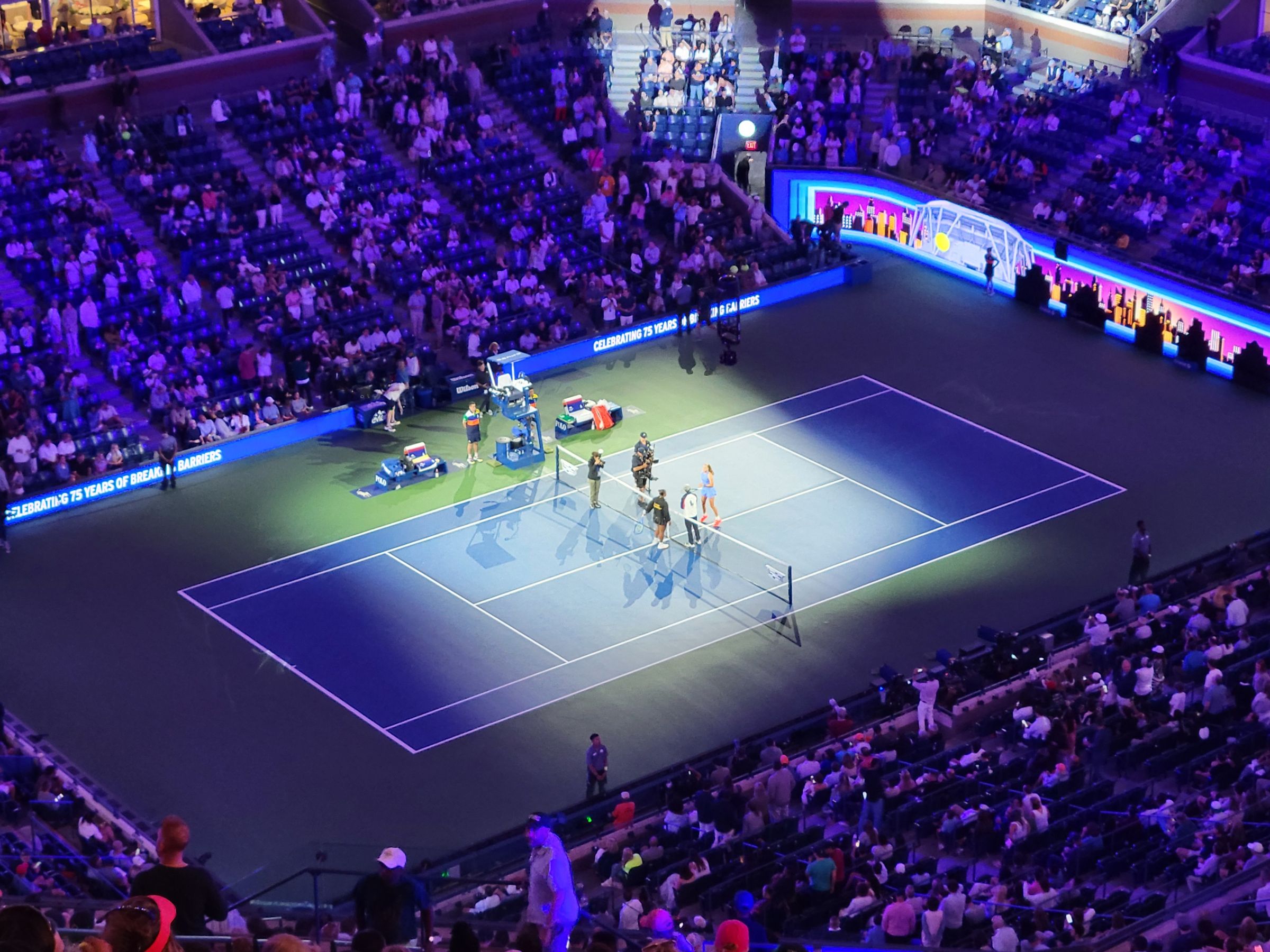하늘색 옷이 18살의 러시아 선수 미라 안드레바(Mirra Andreeva)로 5번 시드의 강자이고, 맞은편의 29살의 미국 선수 테일러 타운센드(Taylor Townsend)로 단식 랭킹은 143위에 불과했다. 즉, 미국과 러시아의 대결이라서 시작 전부터 관중석에서 "USA" 함성을 지르는 사람들이 있었다.