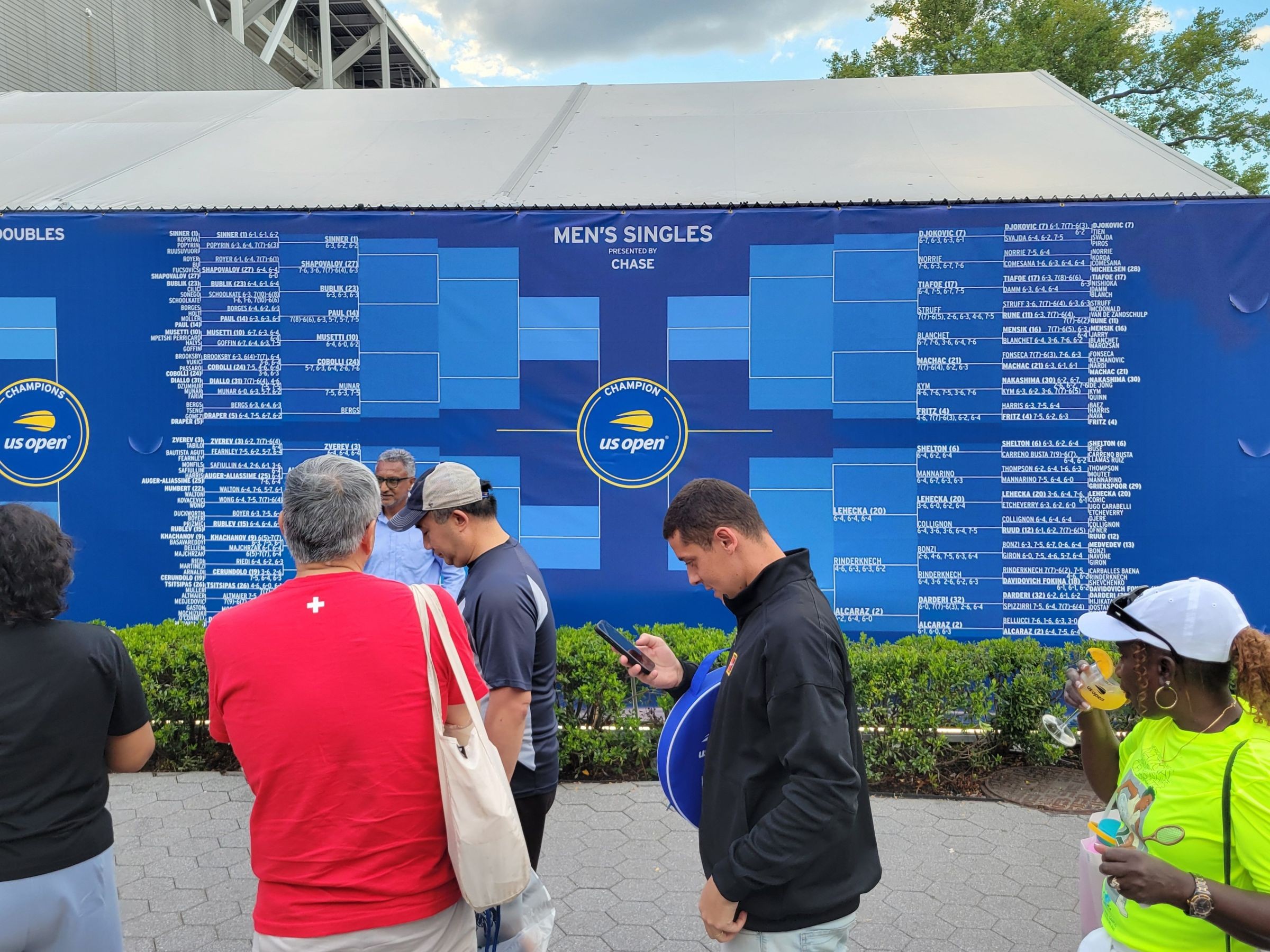 보안검색과 표검사를 통과해서 들어오니까, 제일 먼저 오른편으로 대진표들이 눈에 띄었다. 사진은 남자단식 본선 128명의 대진표로 좌측 제일 위에 현재 세계 랭킹 1위로 1번 시드를 받은 야닉 시너(Jannik Sinner), 우측 제일 아래에 2번 시드의 카를로스 알카라즈(Carlos Alcaraz) 이름이 있다. 그리고 우측 제일 위에 38세의 노박 조코비치(Novak Djokovic)가 보이는데, 저녁 7시에 우리가 보는게 바로 그의 3라운드 경기이다.