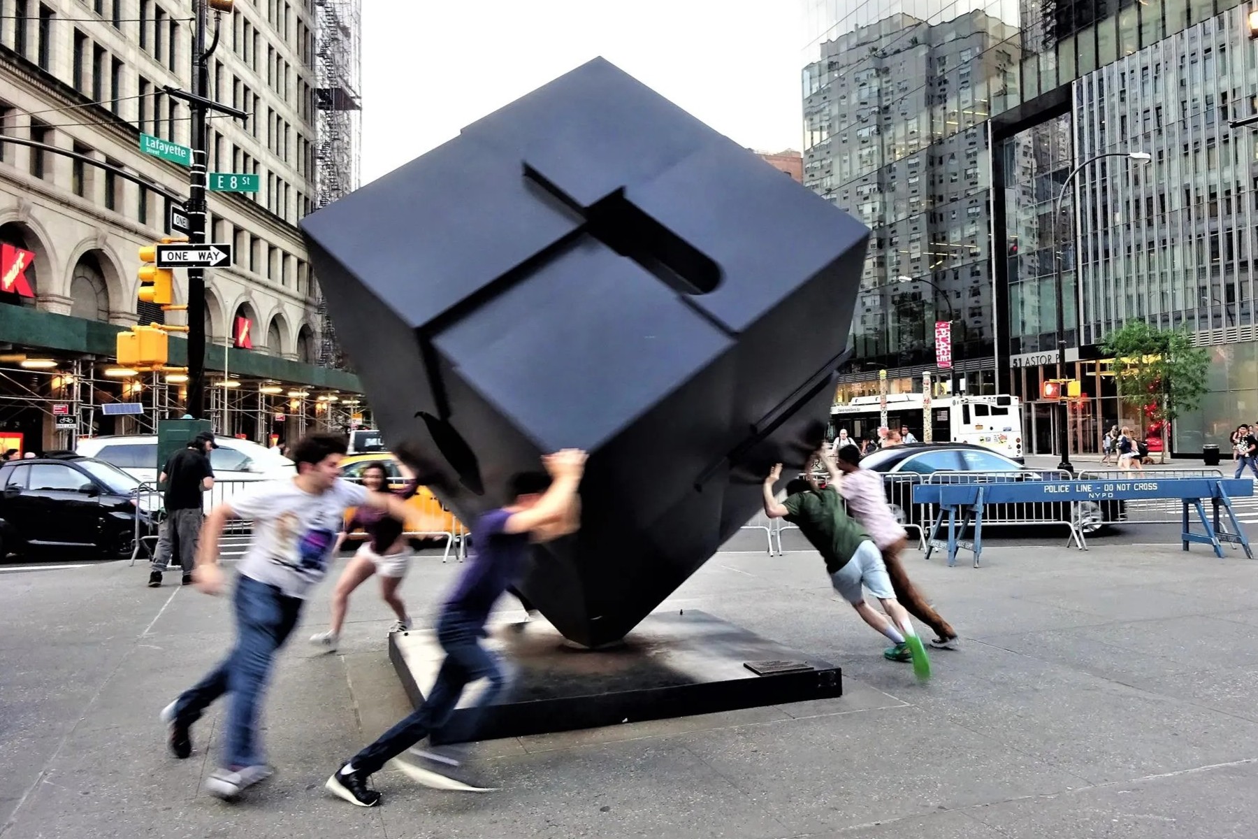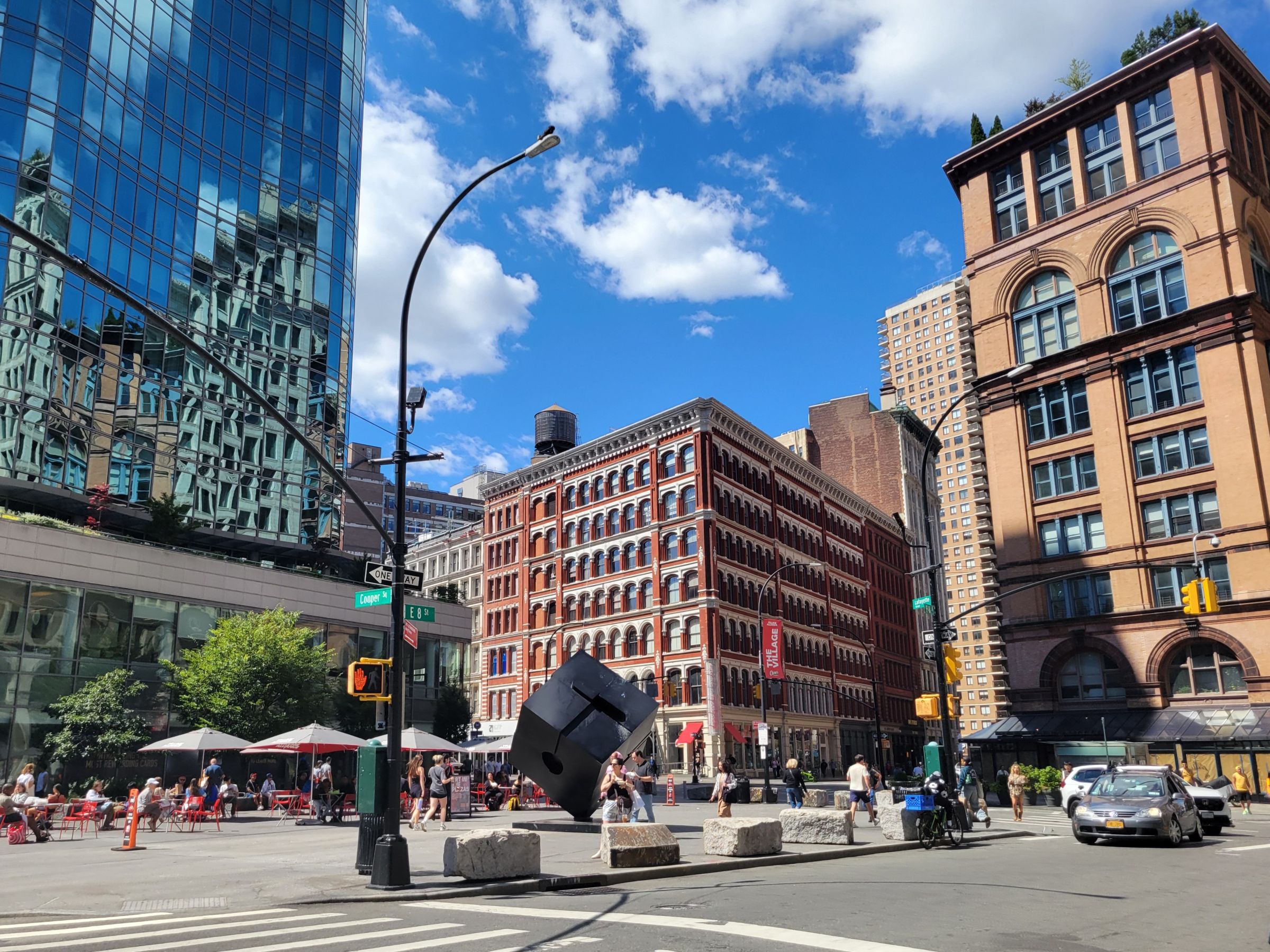 다음은 이스트빌리지, 노호, 그리니치빌리지 동네들이 접하는 '만남의 광장'이라 할 수 있는 애스터 플레이스(Astor Place)로 동명의 그린라인 지하철역이 아래에 있다. (구글맵으로 위치를 보시려면 클릭) 여기는 1848년 사망할 때 미국에서 가장 부유했던 존 제이콥 애스터(John Jacob Astor)를 기리는데, 뉴욕 공공도서관 포스팅에도 이름이 등장했었고 월도프 아스토리아 호텔과 오레곤 태평양 연안의 아스토리아(Astoria) 지명의 유래이기도 하다.