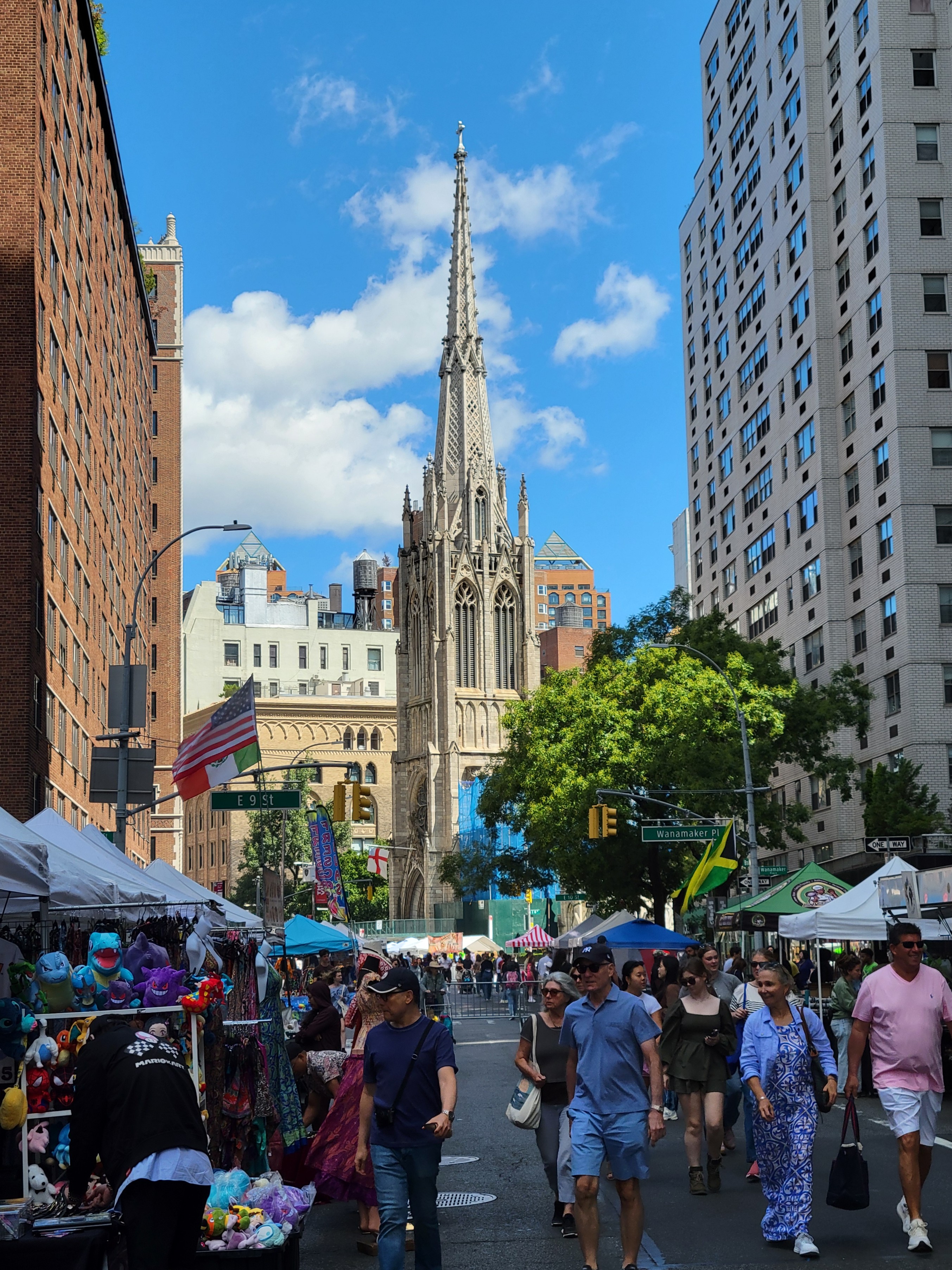 우리는 지하철을 타지 않고 한 블럭 더 서쪽으로 걸어가 브로드웨이(Broadway)의 토요장터를 구경하며 북쪽으로 올라갔다. 맨하탄 남쪽 끝의 배터리 공원에서 다른 남북 방향의 도로들과 평행하게 시작되는 브로드웨이는, 정면에 보이는 교회 앞의 10th St를 지나서부터 삐딱하게 사선으로 바뀌어 타임스퀘어와 그 너머로 계속 이어진다.