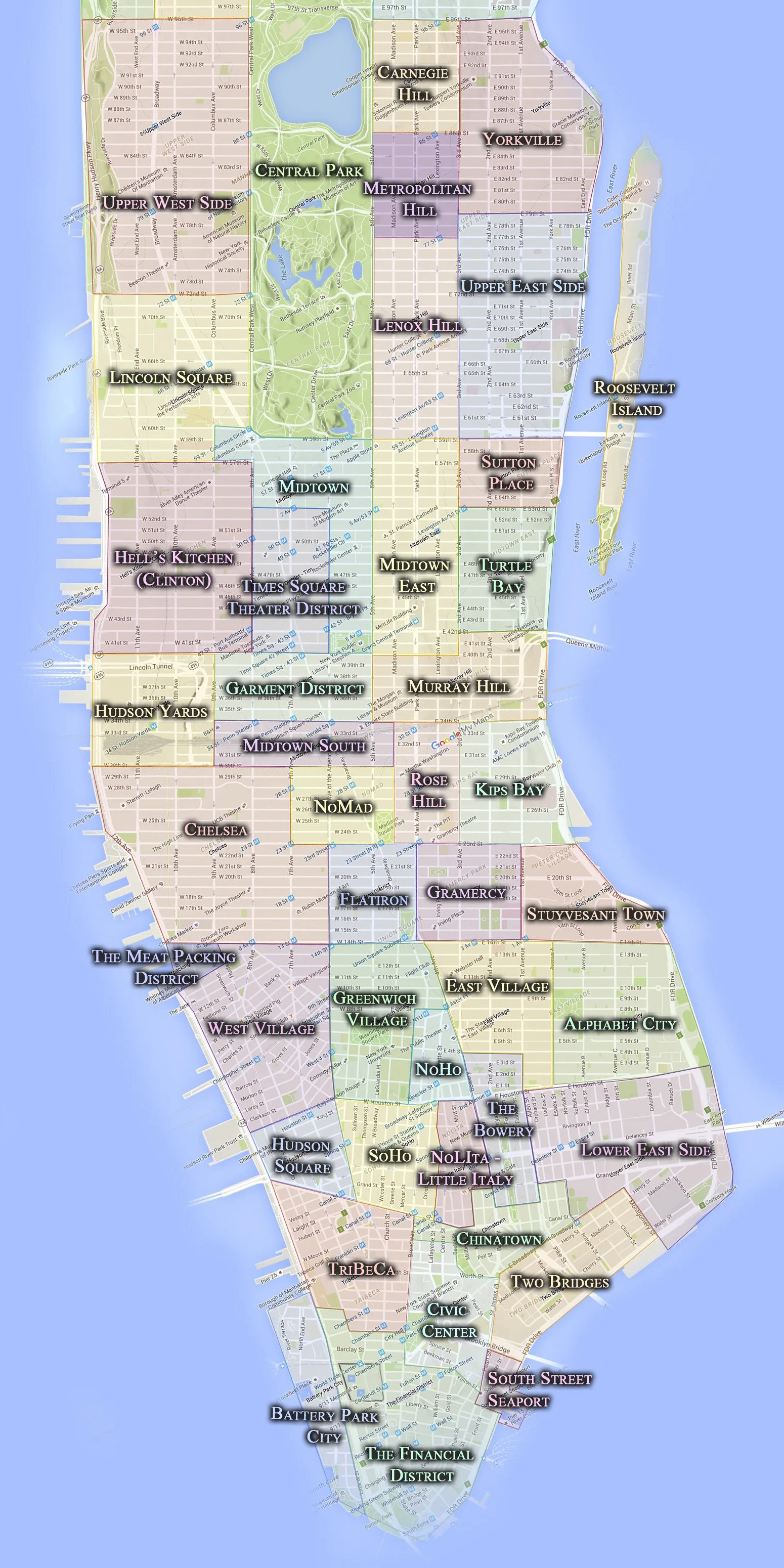 그래서 결국은 또 찾아봤다! 남북으로 아주 길쭉한 '맨하탄의 동네들(Manhattan neighborhoods)' 전체 지도의 아래쪽 절반 정도인 센트럴파크까지만 잘라서 보여드린다. 위키피디아의 훨씬 더 복잡한 동네 설명부터 조금 단순한 구분까지 다양한 지도가 있었는데 이게 가장 마음에 들었다. 지도의 하부 가운데애 이스트빌리지가 있고, 그 왼편으로 소호, 그리니치빌리지, 다시 대각선으로 첼시, 그리고 그 위쪽에 타임스퀘어와 미드타운 등등 지금까지 들어본 동네들이 대강 맨하탄 내에서 어디쯤 위치하는지 파악이 가능해졌다.