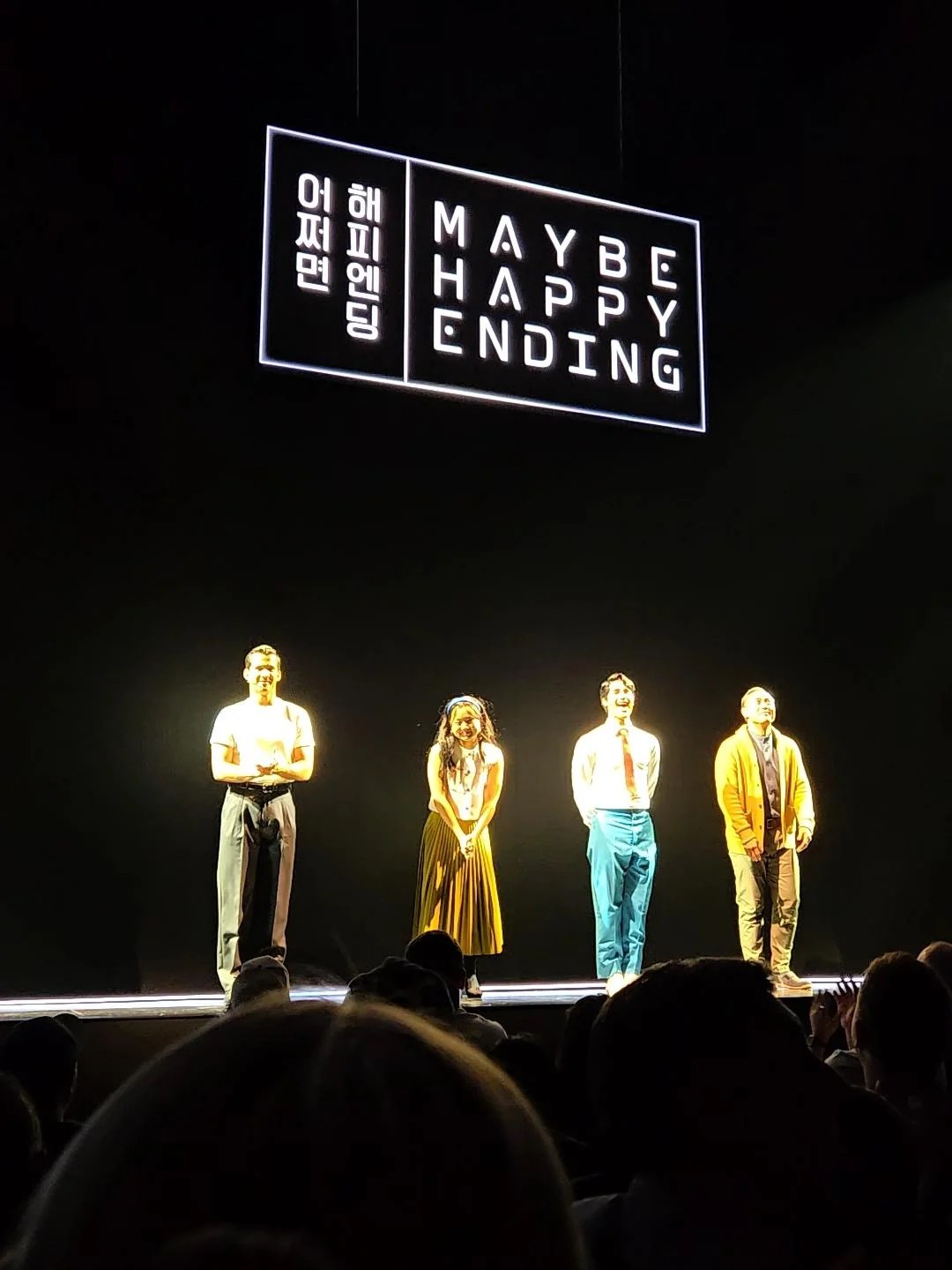 먼저 오리지널 공연 포스터를 보여드리면, 영어제목은 그대로 직역해 <Maybe Happy Ending>으로 줄여서 'MHE'로 불리기도 한다. 가까운 미래의 한국이 배경이고 서울, 화분, 제주 등의 한국말이 대사에 나오지만, 남자 주인공은 물론이고 여자 주인공도 중국계로 둘 다 미국인이다. 소니가 제작하고 넷플릭스가 히트시킨 '케데헌'과 마찬가지로, 뉴욕 브로드웨이 베테랑들이 제작과 연출을 맡아서 미국 관객들이 좋아할 작품으로 재탄생한 'K-뮤지컬'이라 할 수 있다.