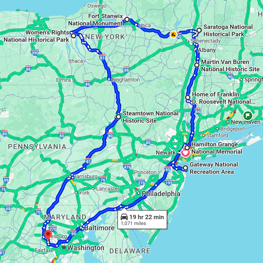 위의 초승달같은 경로를 시계방향으로 돌았는데, 2박3일 동안 실주행 거리는 1,200마일도 넘었다. 지도에 표시된 곳들 외에도 들린 장소가 많아서 모두 12개의 NPS official unit들이 리스트에 추가될 예정이며, 국립 공원 외에 서너곳 정도 관광지(?)도 사이사이에 등장하게 된다. 뉴욕 주에 속하지 않는 장소가 경로상 처음과 마지막에 각각 하나씩 딱 2곳뿐이었는데, 첫날 5시에 출발해서 두 시간을 달려 펜실베니아 주청사가 있는 해리스버그에서 아침을 먹고 또 두 시간을 더 운전해 도착한 첫번째 공원부터 시작한다.