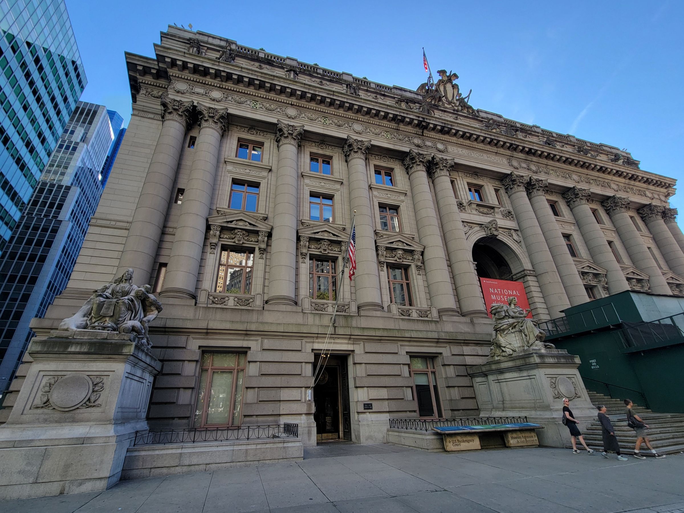 빨간 배너가 걸려있는 2층 출입구로 나와서 계단을 내려와 뒤돌아 건물 전체를 바라 본 모습이다. 화려한 보자르 양식으로 지어져서 맨하탄에서 역사적 중요성을 가지는 대표적인 건물이며, 처음에 세관으로 건축되었기에 건물 정면의 여러 조각들이 관련된 여러가지 의미를 가지는 것으로 유명하다. 특히 별도의 기단에 올려진 대리석으로 만든 '4대륙(Four Continents)' 작품이 유명한데, 이 사진에서는 왼편의 2개만 보인다. (오른편 2개의 조각을 청소하는 중이라 가려 놓았음)