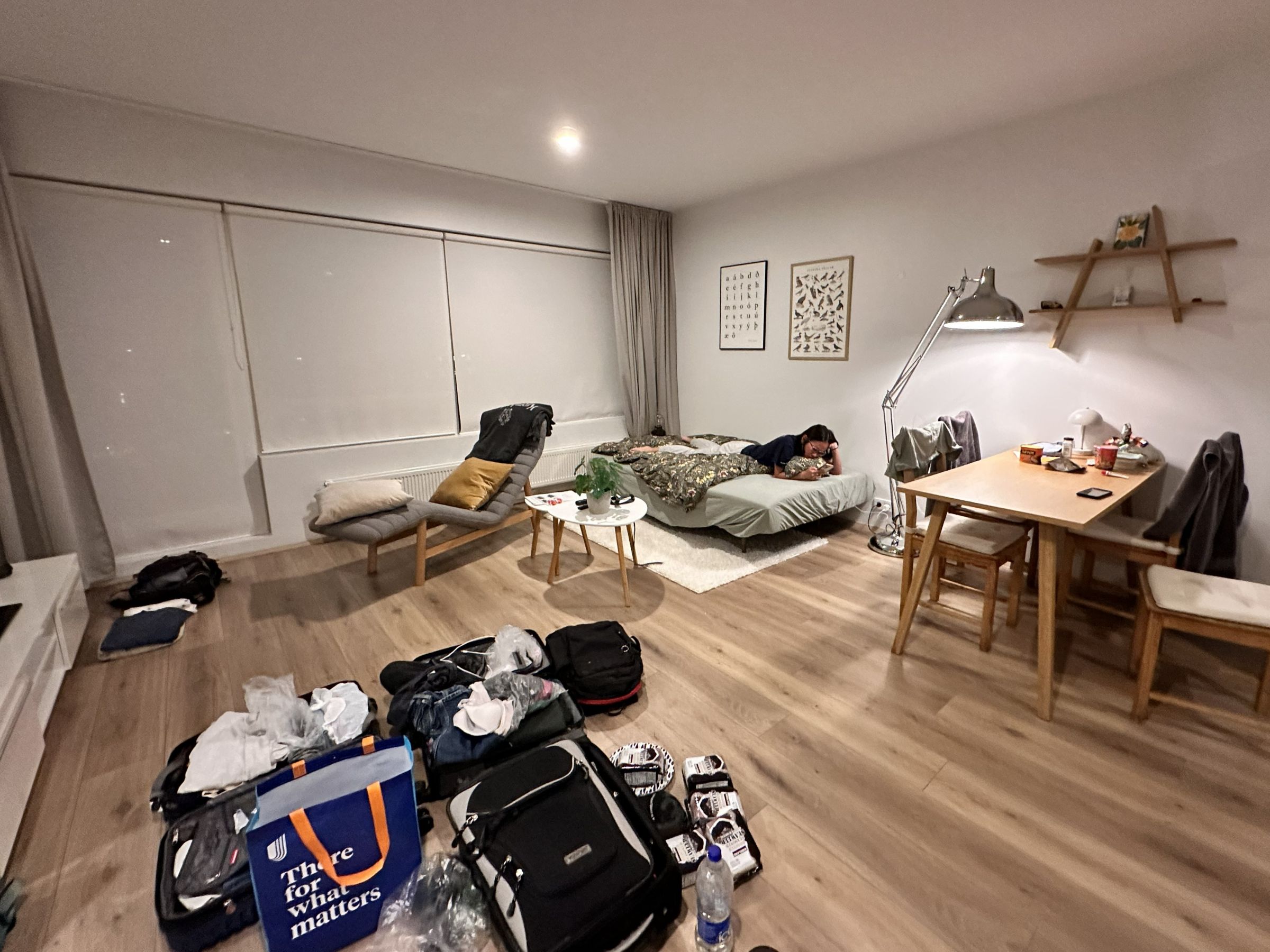 레이캬비크 교외의 에어비앤비 숙소에 어김없이 밤 10시가 넘어 도착을 해서, 스팸 구이와 남은 반찬으로 저녁을 맛있게 먹고 여행기 프롤로그에 언급했던 것처럼 남은 맥주 예닐곱 캔을 모두 마시며 즐거운 대화를 나눈 후에, 새벽 1시쯤 잠자리에 들기 직전에 짐을 모두 펼쳐놓은 지저분한 모습이다. 소설 <지구 속 여행>의 주인공들은 아이슬란드 화산의 분화구로 들어가서 모험을 한 후에 분출하는 용암을 타고 다시 땅 밖으로 나오니 이탈리아 남부의 어떤 화산섬이었다고 하지만, 다음날 우리는 뗏목 대신에 비행기를 타고 대서양을 건너 미국으로 돌아간다.