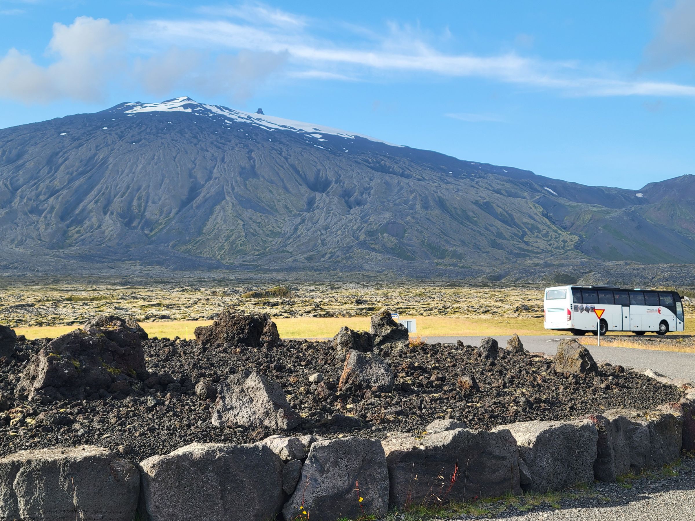 얼핏 낮아 보이지만 1,446 m 높이의 약 70만년 전에 폭발해서 만들어진 순상화산으로 정상부에 빙하와 함께 '지하세계'로 이어지는 통로가 있는 것이 특징이다.^^ 여기는 도로변에 넓은 주차장이 만들어져 있어서 커다란 관광버스들도 보였는데, 수도 레이캬비크에서 당일 투어로 스나이펠스네스 반도 투어를 할 때 반드시 들리는 가장 유명한 볼거리가 있기 때문이다. 참, 빙하와 반도의 이름 앞에 공통으로 들어간 '스나이펠스'는 비슷한 영어 발음의 '스노우폴(snow fall)'이란 뜻이란다~
