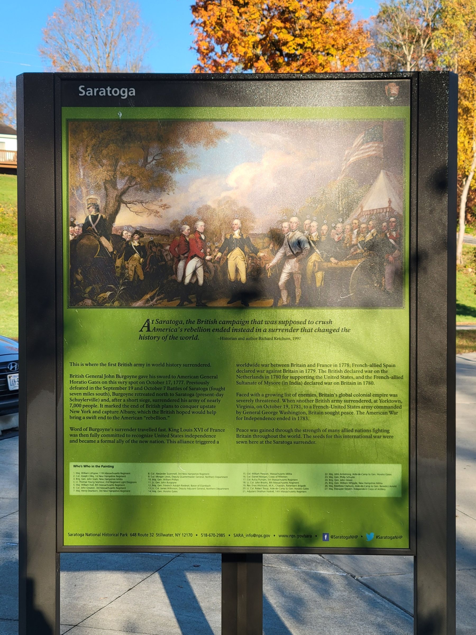 여기를 클릭해 보실 수 있는 1부에서 설명드린 두 번의 공격이 모두 실패한 후에, 전장에서 몇 마일 북쪽의 작은 마을로 후퇴했던 존 버고인(John Burgoyne) 소장이 이끄는 영국군이 열흘이 지난 10월 17일에 호레이쇼 게이츠(Horatio Gates) 소장의 대륙군에게 이 자리에서 항복을 하게 된다. 이는 당시 세계를 주름잡던 대영제국의 장군이 통솔하는 5천명 이상의 정규군이 야전에서 항복한 역사상 최초의 사례라 한다. 그것도 다른 유럽의 강대국이 아니라 아메리카 식민지의 반란군에게!