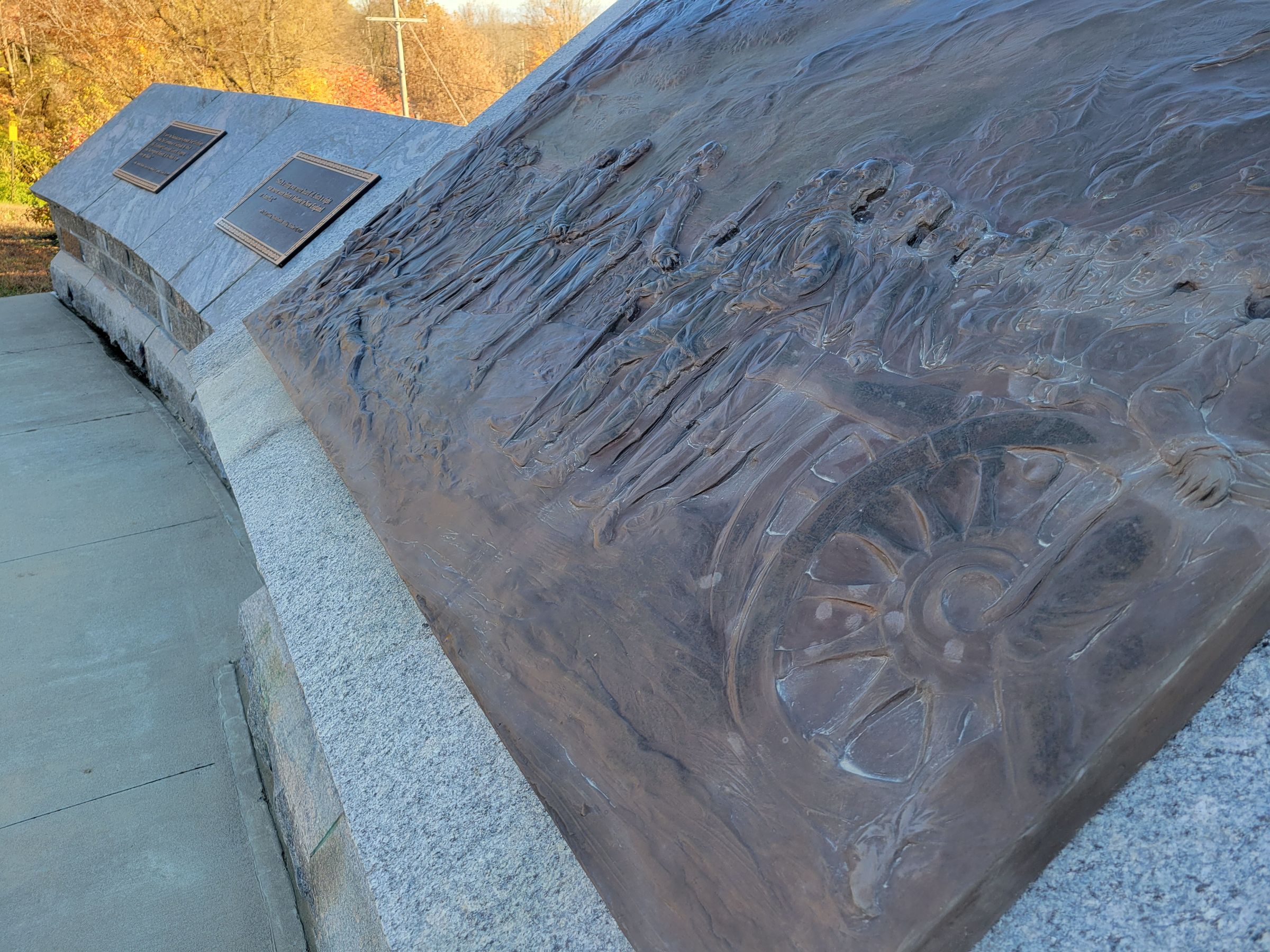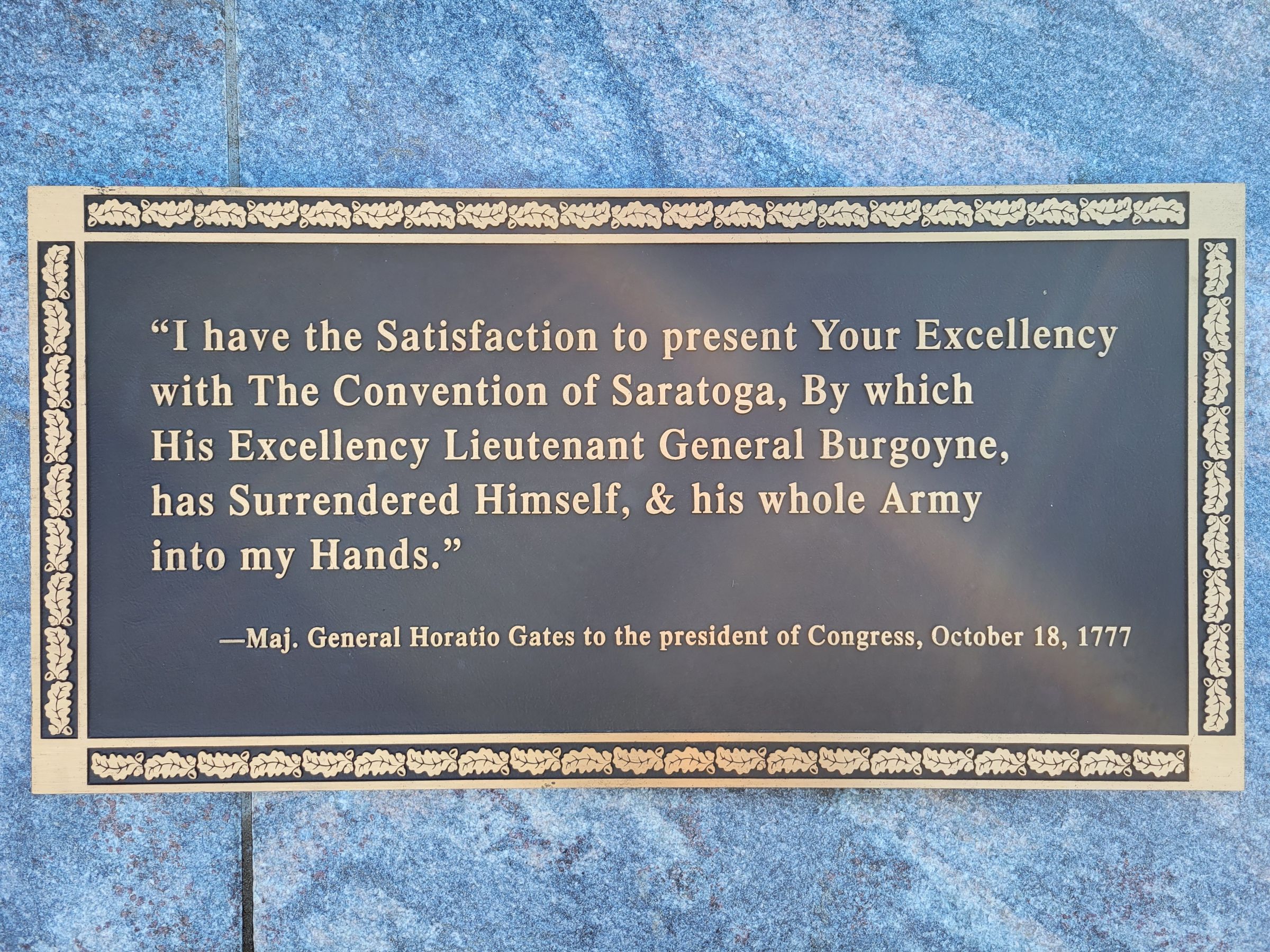 기념물의 중앙에 부조로 새겨진 그림에 대해서는 따로 설명할 예정이고, 좌우로 4개의 어록이 동판으로 만들어져 있는데 게이츠 장군이 다음날 의회에 승전보를 알린 문장을 아래에 보여드린다. 꼼꼼히 1부를 읽어보셨다면 아시겠지만 게이츠는 전투 직전에 북부군 사령관으로 부임해 와서, 두 번의 전투 동안에 계속 수비만 주장하며 요새 밖으로 한 발자국도 안 나왔었다...