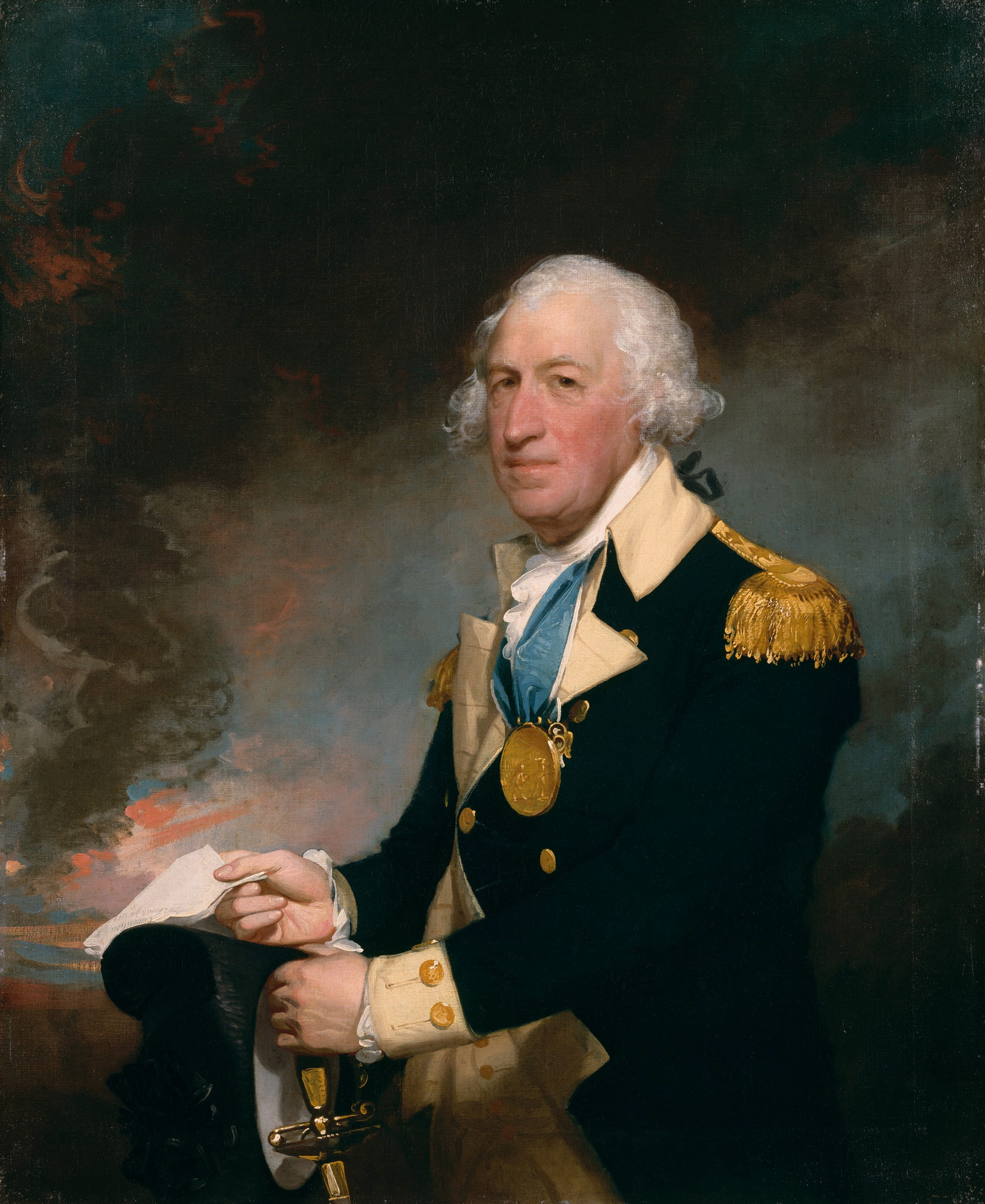 커다란 의회 황금 메달을 자랑스럽게 걸고 있는 호레이쇼 게이츠의 초상화지만... 여차저차해서 그는 1780년에 다시 남부군 사령관으로 임명되지만, 그 해 8월 사우스캐롤라이나 캠던(Camden)에서 벌어진 전투에서 수적우위에도 불구하고 잘못된 용병술로 영국군에게 대패하고 혼자 북쪽으로 300 km를 쉬지 않고 줄행랑을 친다. 친분이 있는 의원들의 로비로 군사재판은 면하고 종전때까지 참모직은 유지했지만, 그는 흔히 미국 역사상 최악의 장군들 중의 하나로 항상 언급된다.