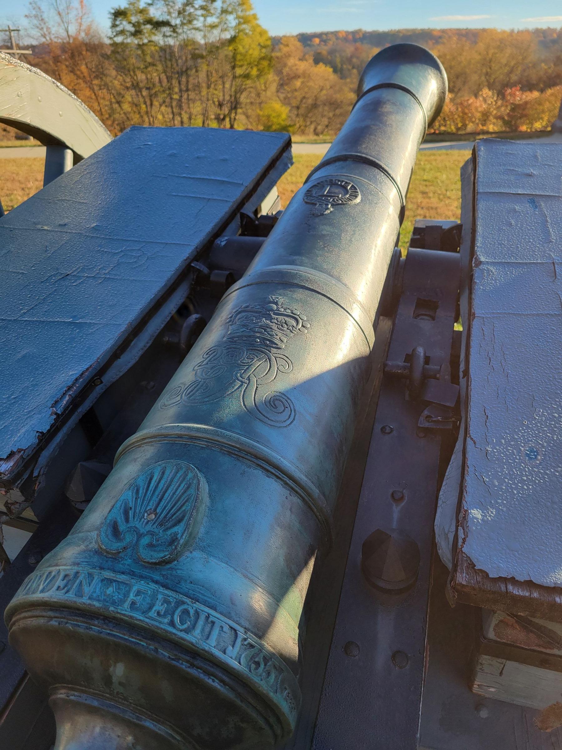 포신에 영국 왕실을 상징하는 왕관과 대문자 'R'이 새겨진 이 대포는, 항복한 영국군의 왕립 포병대로부터 압류한 것의 모조품이라 한다. 당시 30문 이상의 대포를 압류해서 계속 이어진 독립 전쟁에 대륙군이 대부분 사용을 했고, 지금까지 몇 개 남아있는 실물은 다른 박물관 등에 보존되어 있단다. 좌우로 두 개가 원래 설치되었던 모양인데 오른편의 것은 누가 훔쳐갔는지 사라지고 없었다.^^