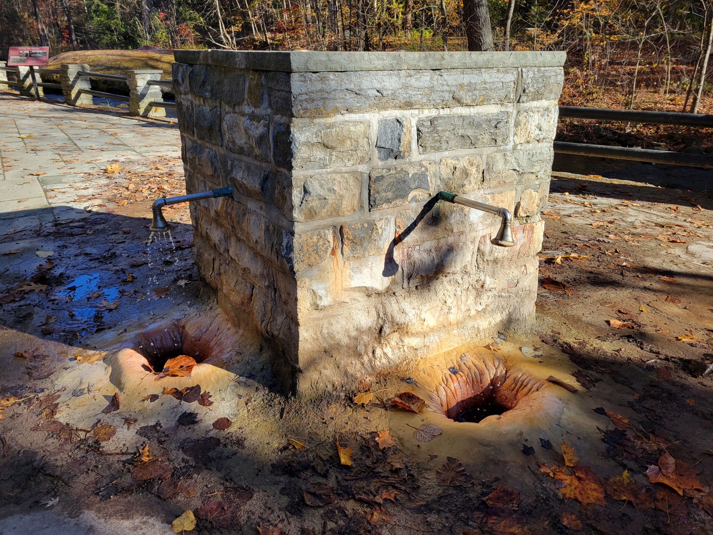 흘러오는 개울물과 함께 샘물이 분출하는 모습을 세로 동영상으로 찍은 것을 클릭해서 보실 수가 있다. 개울 건너편에서 좀 더 가까이 접근은 가능하지만, 물이 솟아 나오는 바위 위로는 역시 올라갈 수 없기 때문에, 여기 주립공원에서 직접 물맛을 볼 수가 없는 유일한 샘물이다.