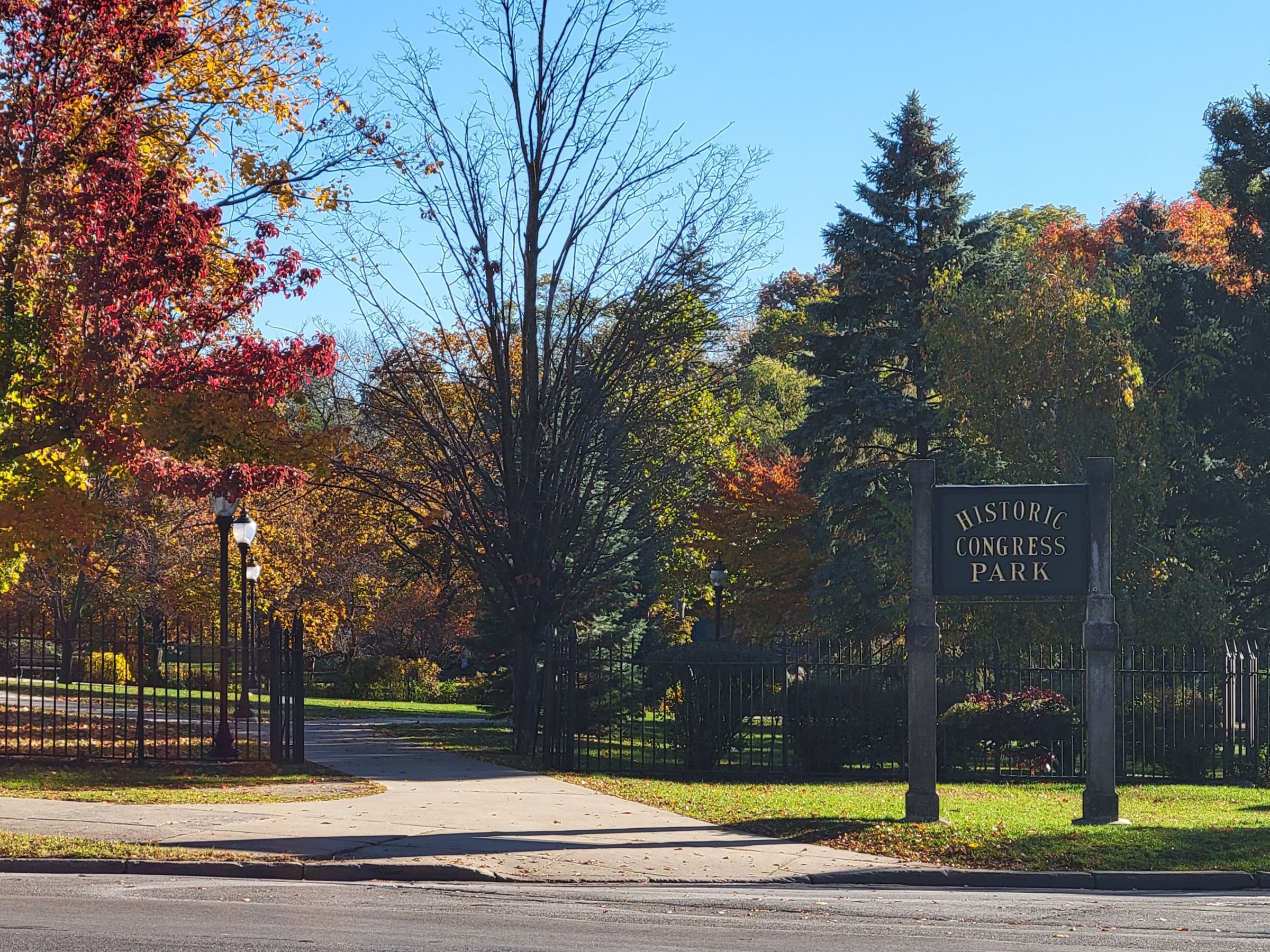 북부 뉴욕주 2박3일 솔로 여행의 둘쨋날 아침에 사라토가 국립역사공원 구경을 끝내고 사라토가스프링스에 도착해서, 시내에서 첫번째로 꼽히는 관광지인 콩그레스 파크(Congress Park) 건너편에 일단 차를 세웠다. 하지만 공원내 역사박물관과 100년 넘은 회전목마 등을 구경하기에는 이 날의 일정이 빠듯했기에 시내 남쪽의 커다란 주립공원에만 집중하기로 했다.