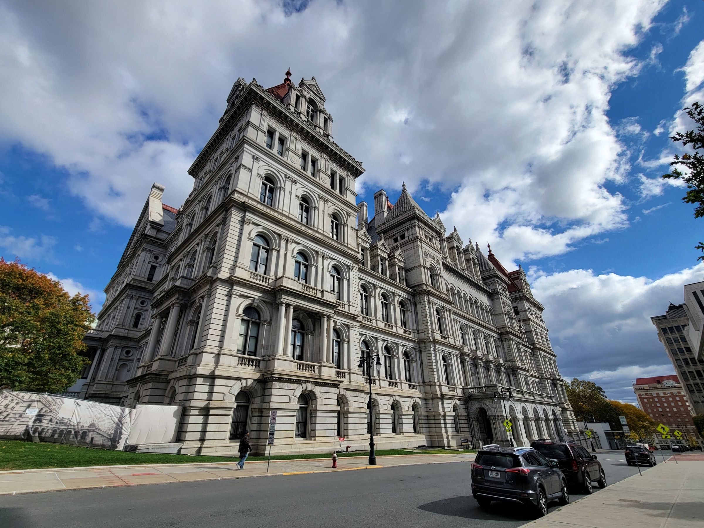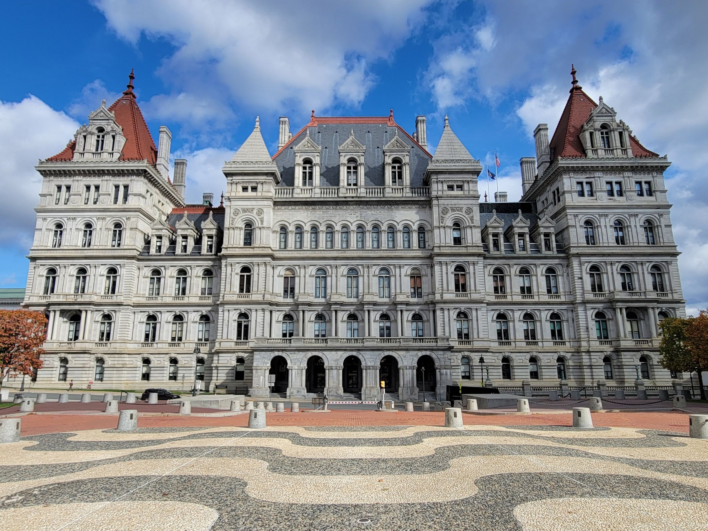 뉴욕주 의사당(New York State Capitol)은 32년 동안 5명의 건축가가 바뀌면서 1899년에 완공될 당시에 총 2,500만 달러, 현재가치로는 8억 달러의 건축비가 들어서 미국에서 가장 비싼 공공건물이었다 한다. 도로변에 주차를 하고 건물의 정면 모습을 보기 위해 걸어가니 남서쪽으로 넓은 엠파이어스테이트 광장(Empire State Plaza)과 함께 다른 현대식 관공서 건물들이 나왔다. (구글맵으로 위치를 보시려면 클릭)