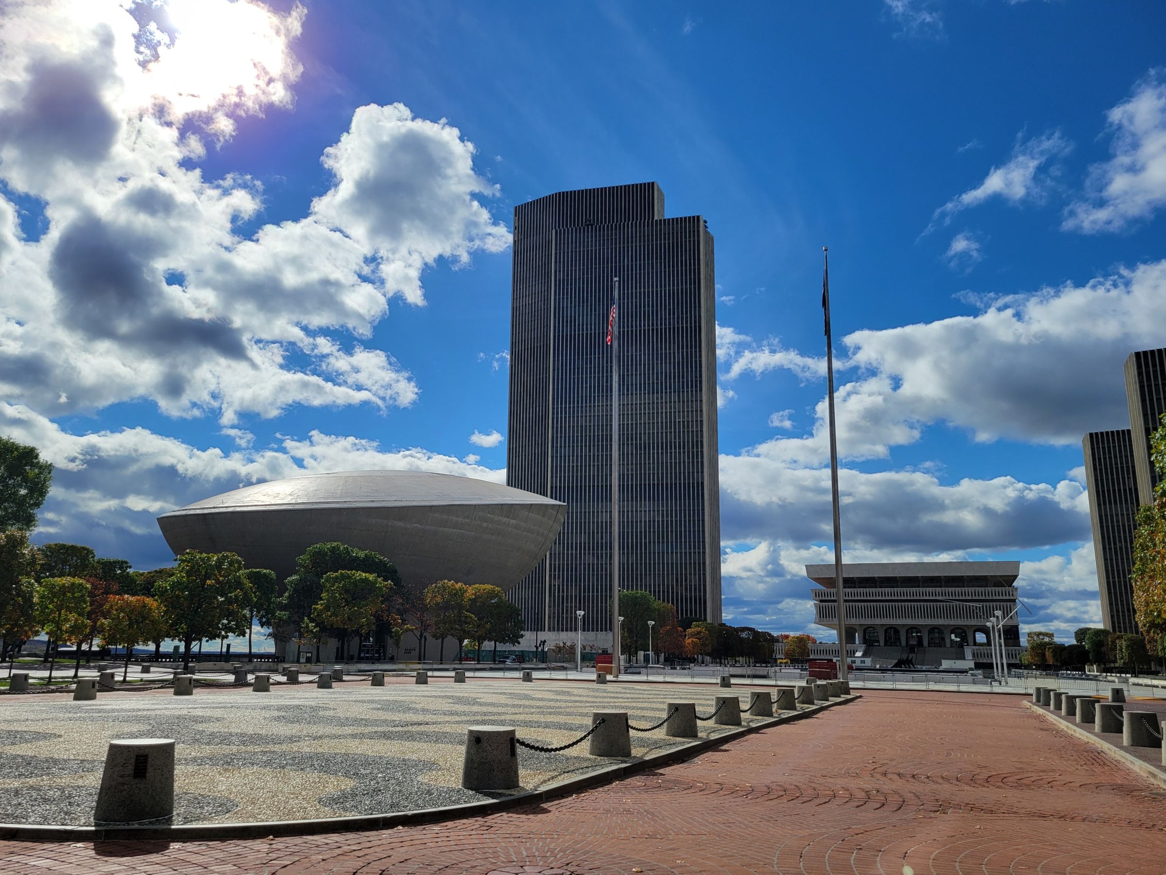 주청사를 마주보고 있는 나지막한 건물은 주립 박물관 및 도서관 등으로 사용되고, 그 왼편의 무료 전망대가 있는 44층의 코닝타워(Corning Tower)는 높이 180m로 뉴욕시를 제외한 뉴욕주에서 가장 높은 건물이다. 그 앞으로 외계 우주선처럼 보이는 둥근 것은 공연장인데, 위성사진을 보면 정확히 달걀 모양으로 만들어져서 공식적인 이름도 '에그(The Egg)'라 한다.