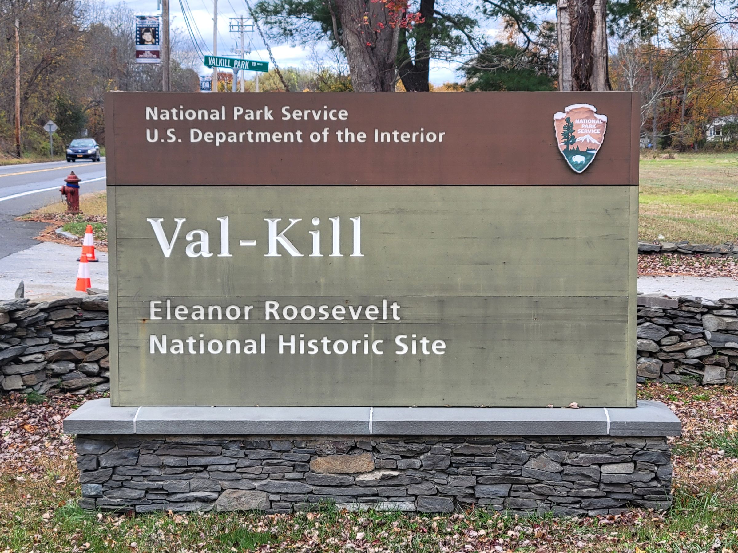 허드슨 강을 따라 올버니와 뉴욕시의 딱 중간쯤에 위치한 하이드파크(Hyde Park) 지역의 9번 국도변에 있는 커다란 간판이다. 국립공원청 로고 옆에 써진 것을 보면 공식명칭이 프랭클린 D. 루스벨트의 집 국립사적지(Home of Franklin D. Roosevelt National Historic Site)로 왠지 '집(home)'이란 단어를 제일 앞에 써서 특히 강조한 느낌이다.
