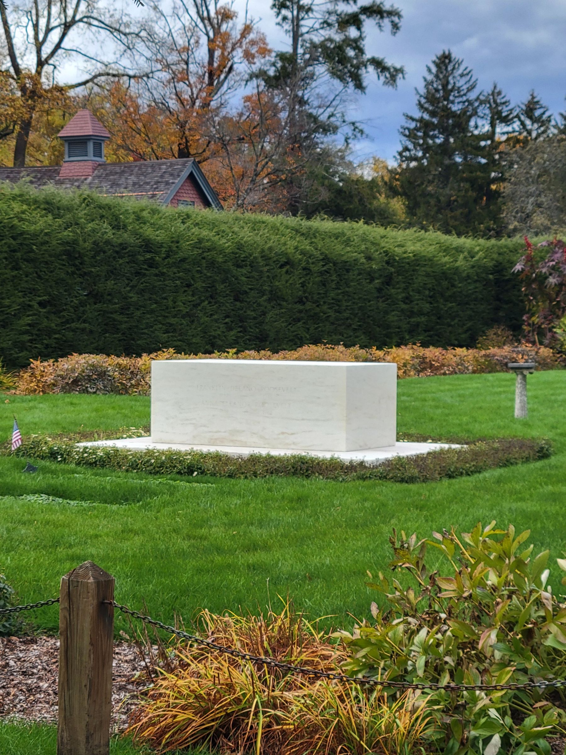 장미정원 안에 묘지가 만들어져 있는데, 당시에는 셧다운 때문에 관리자가 없어서 그런지 철조망으로 막혀 있어서 가까이 갈 수가 없었다. 커다란 흰 대리석은 1962년에 사망한 영부인 엘리너 루스벨트의 이름도 추가되어 공동묘비 역할을 하고, 오른편으로 보이는 작은 기둥 아래에는 애완견 팔라(Fala)도 묻혀있다. 이렇게 부부가 애완견과 함께 영원히 같은 자리에 잠들어 있으나, FDR의 임종을 지켰던 팔라와 다른 한 명은 영부인이 아니라 그가 불륜을 저질렀던 상대인 오랜 연인 루시 머서(Lucy Mercer)였단다...