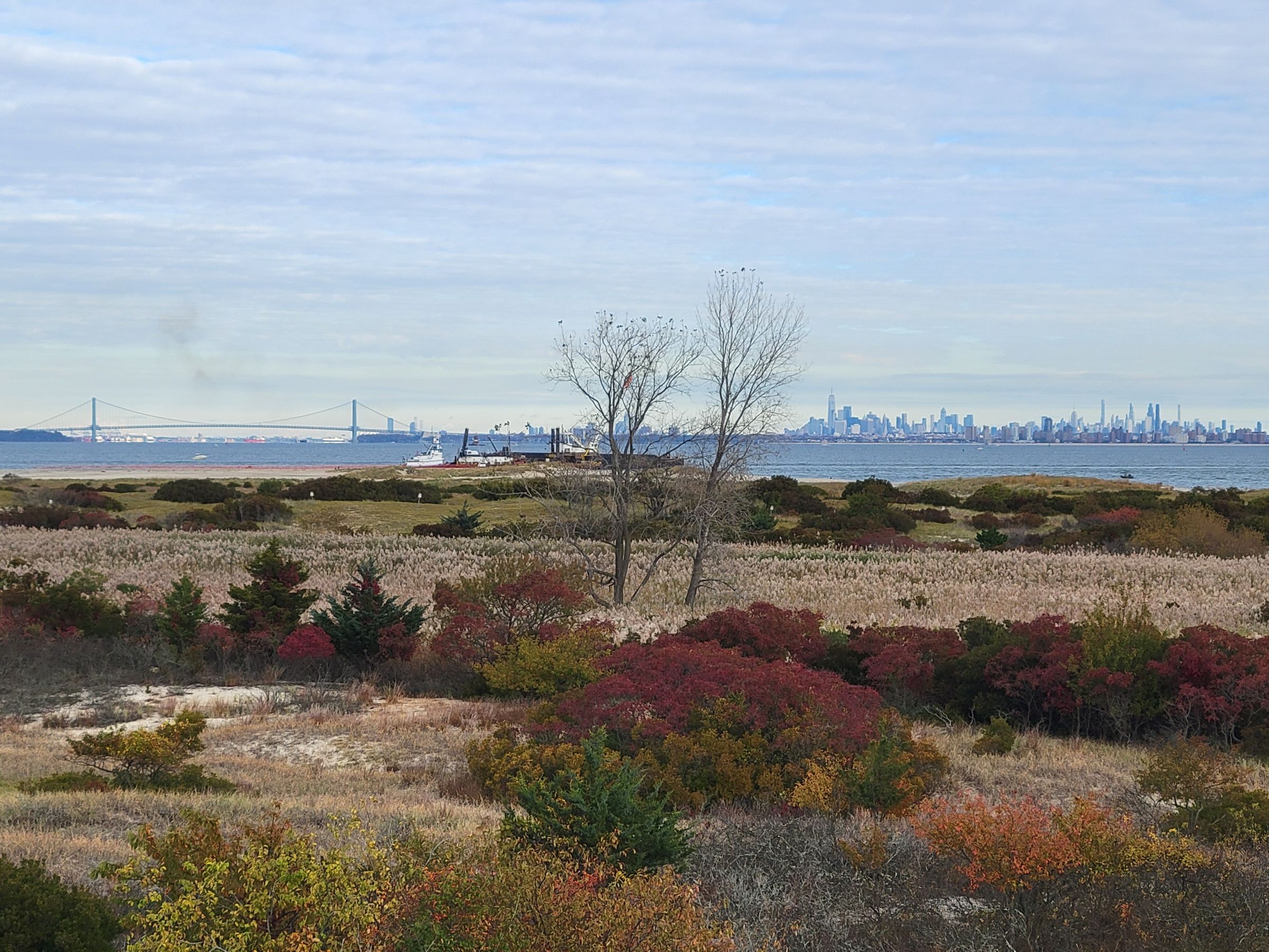 정면을 3배줌으로 당겨보면 대서양 너머로(?) 스테이튼 섬과 브루클린 사이의 해협을 전체 4km 길이로 잇는 현수교인 베라자노-내로스 다리(Verrazzano–Narrows Bridge)와 그 오른편에 맨하탄의 스카이라인이 아스라히 보인다. 이제 핸드폰을 난간 위에 올려놓고 디지털 10배줌으로 당겨보자~
