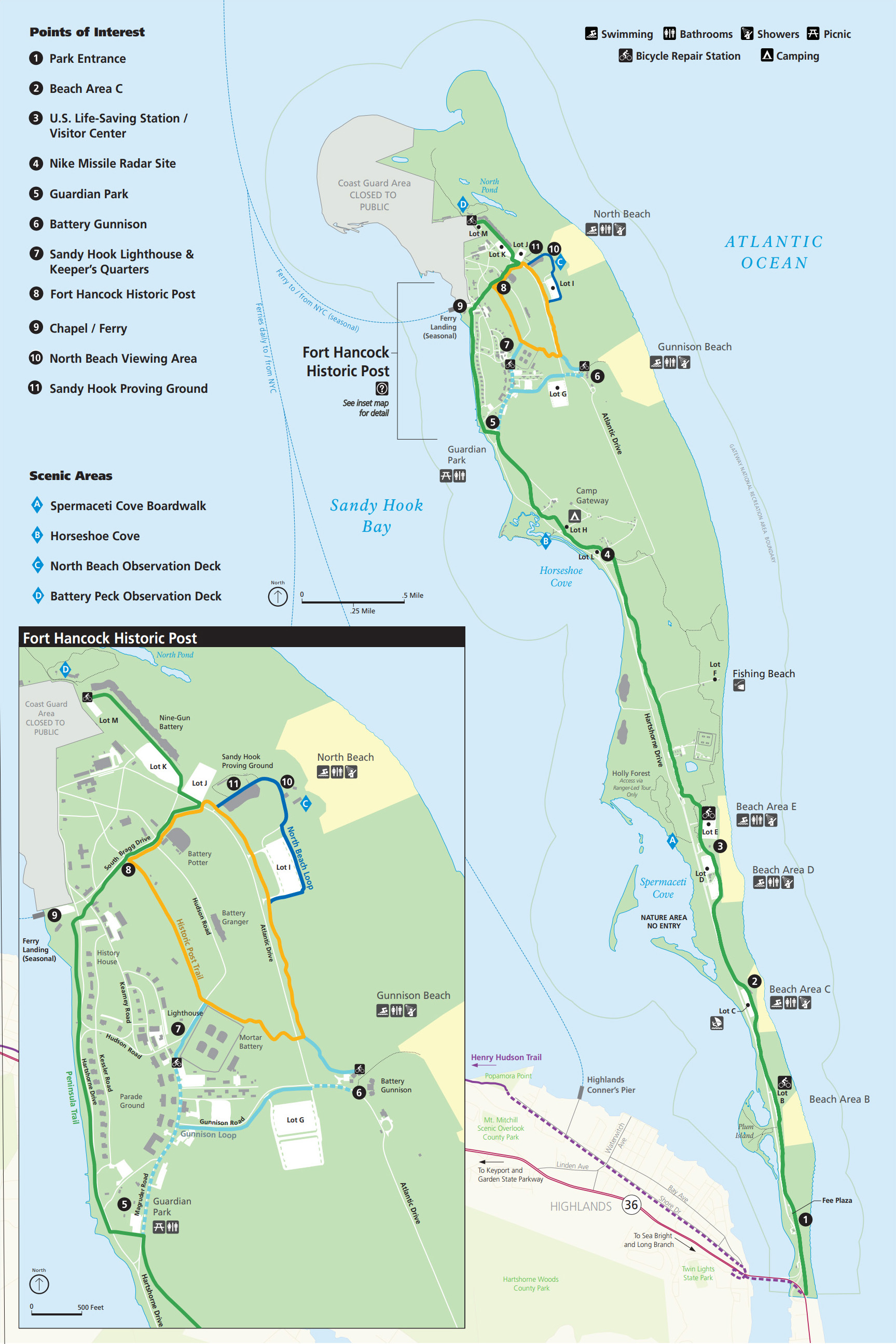 지도에서 아래쪽에 대서양과 면한 해수욕장들은 그냥 지나 ④번까지 올라온 것이고, 이제 가장 핵심적인 역사적 포트 핸콕(Fort Hancock)으로 향한다. 그리고 지도 맨아래의 뉴저지 36번 도로를 다리로 건너 진입하니까 섬으로 보이지만, 훨씬 더 아래쪽에서 육지와 연결되어 있어서 엄밀하게는 샌디훅 반도이다.