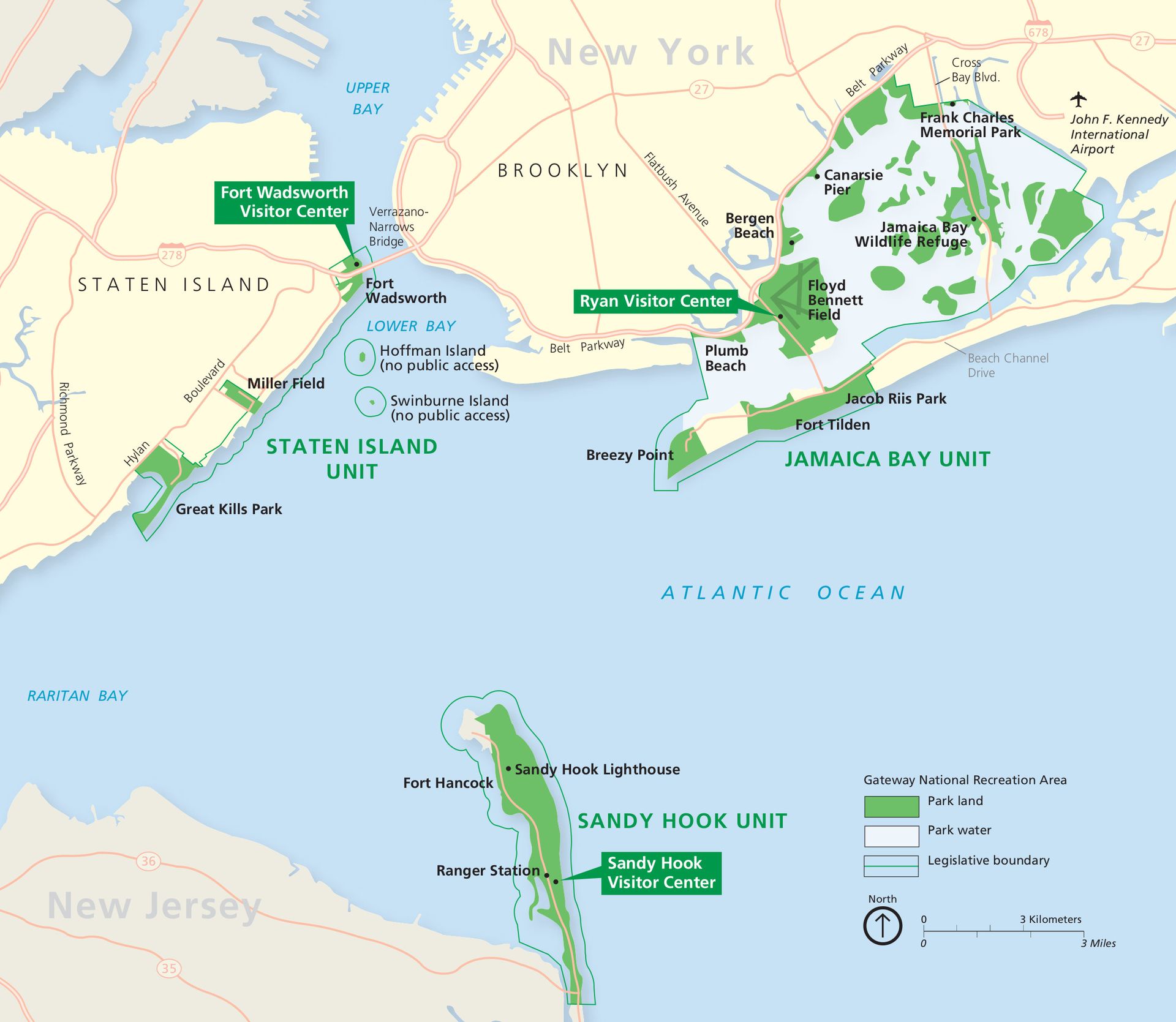 게이트웨이 국립휴양지(Gateway National Recreation Area)는 위와 같이 옛날 미국의 대표적 '관문(gateway)'이었던 뉴욕항 입구에 3개의 유닛으로 나눠져 있다. (지도 상단의 Upper Bay 북쪽에 맨하탄 섬이 있음) 사실 방문 도장만 찍는 것이 목적이라면 브루클린의 자메이카 만(Jamaica Bay) 또는 거기서 다리를 건너면 바로 나오는 스테이튼 섬(Staten Island) 비지터센터가 훨씬 가깝지만, 왠지 아래쪽에 툭 튀어나온 '모래톱'을 제일 먼저 가줘야할 것같은 의무감이 들어 맨하탄에서 5배가 넘는 약 100km 거리를 빙 돌아서 찾아갔다.