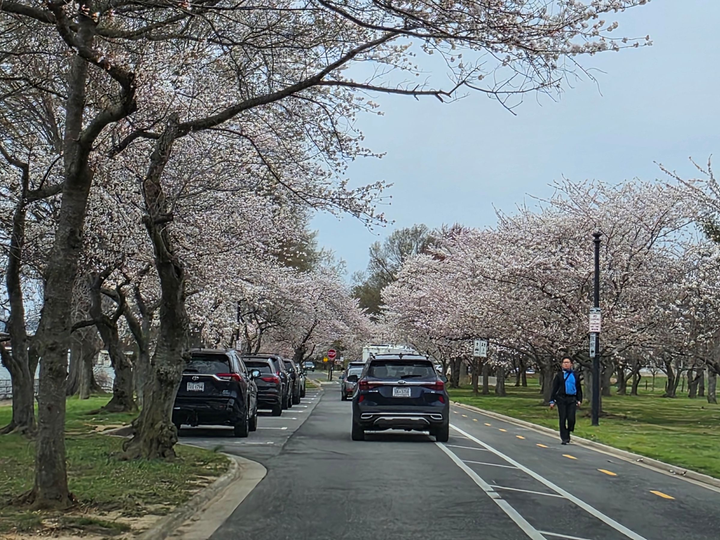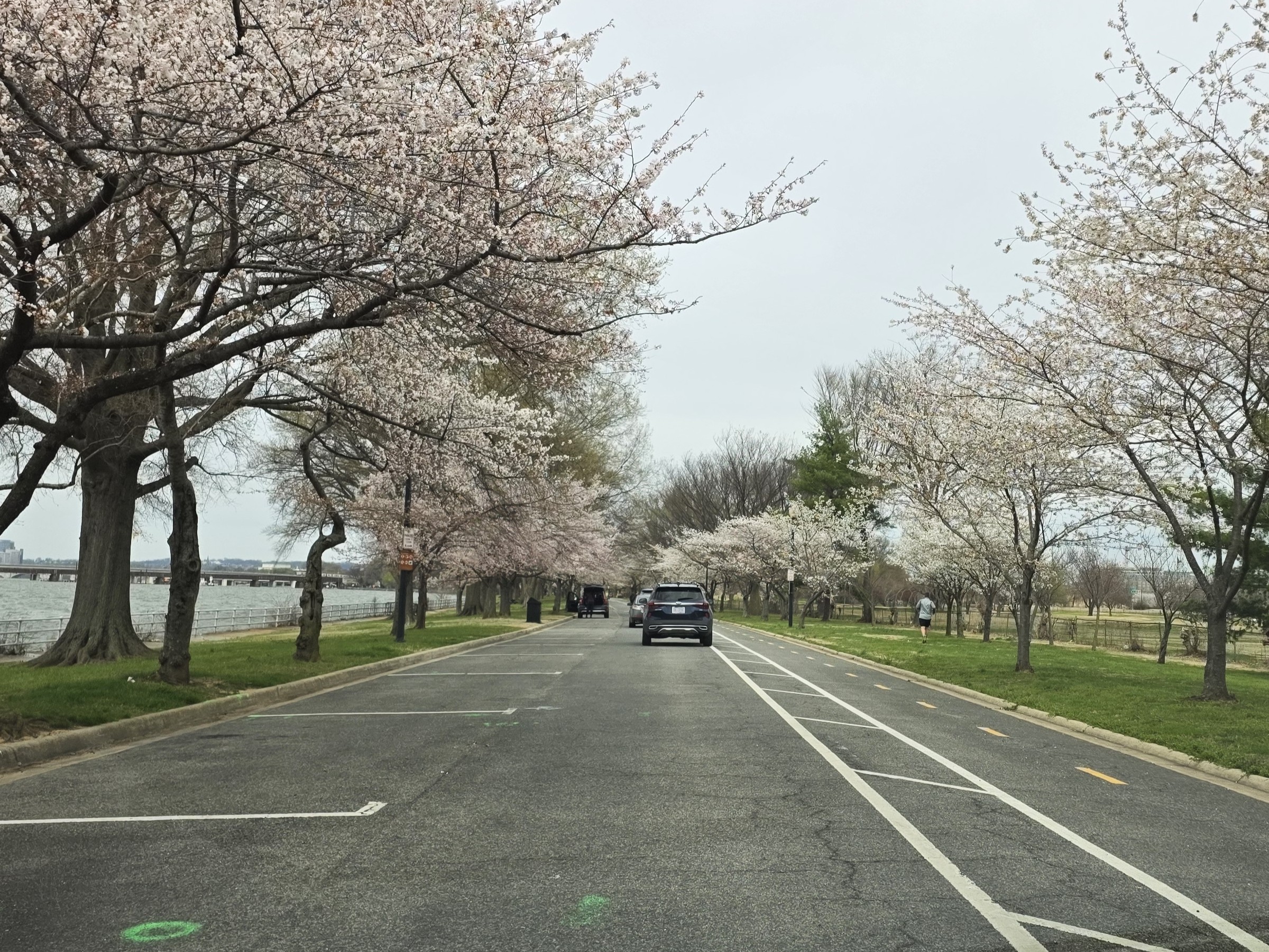 골프장 입구를 지나서부터 일방통행으로 바뀐 순환도로의 가장 남쪽 끝까지 벚꽃 드라이브를 하며 내려와 주차한 모습을 돌아본 사진이지만, 내려오는 길이 모두 이렇게 좌우로 벚나무가 있는 것은 아니었다. 오른쪽으로 보이는 강은 타이들베이슨까지 이어지는 수로인 워싱턴 채널(Washington Channel)로 건너편 북쪽이 DC의 부둣가라 할 수 있는 '와프(The Wharf)'이다. (구글맵으로 위치를 보시려면 클릭)