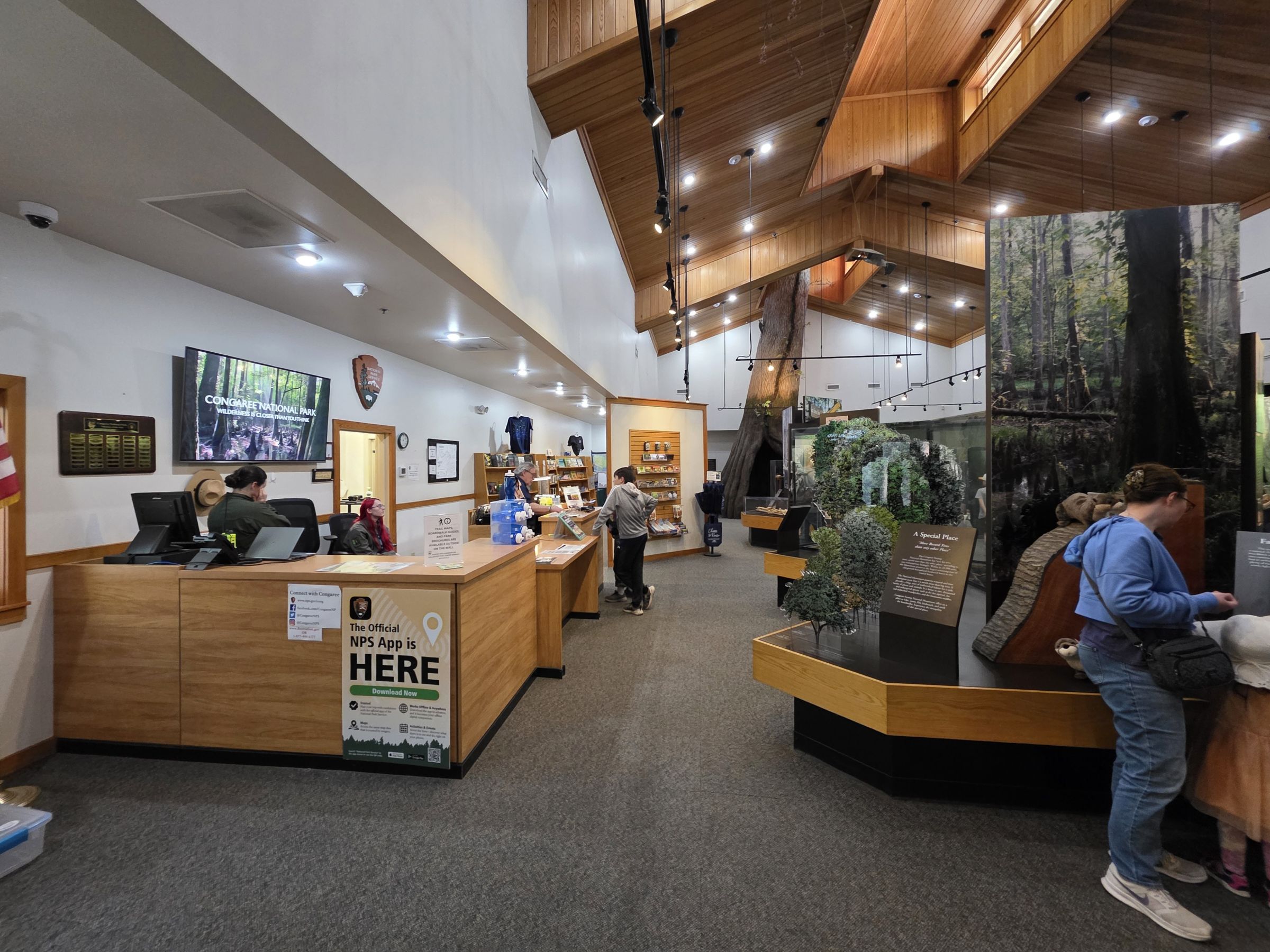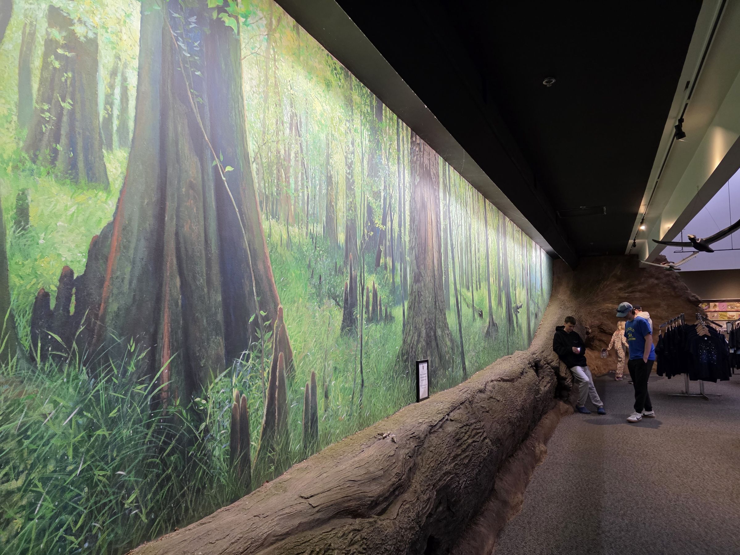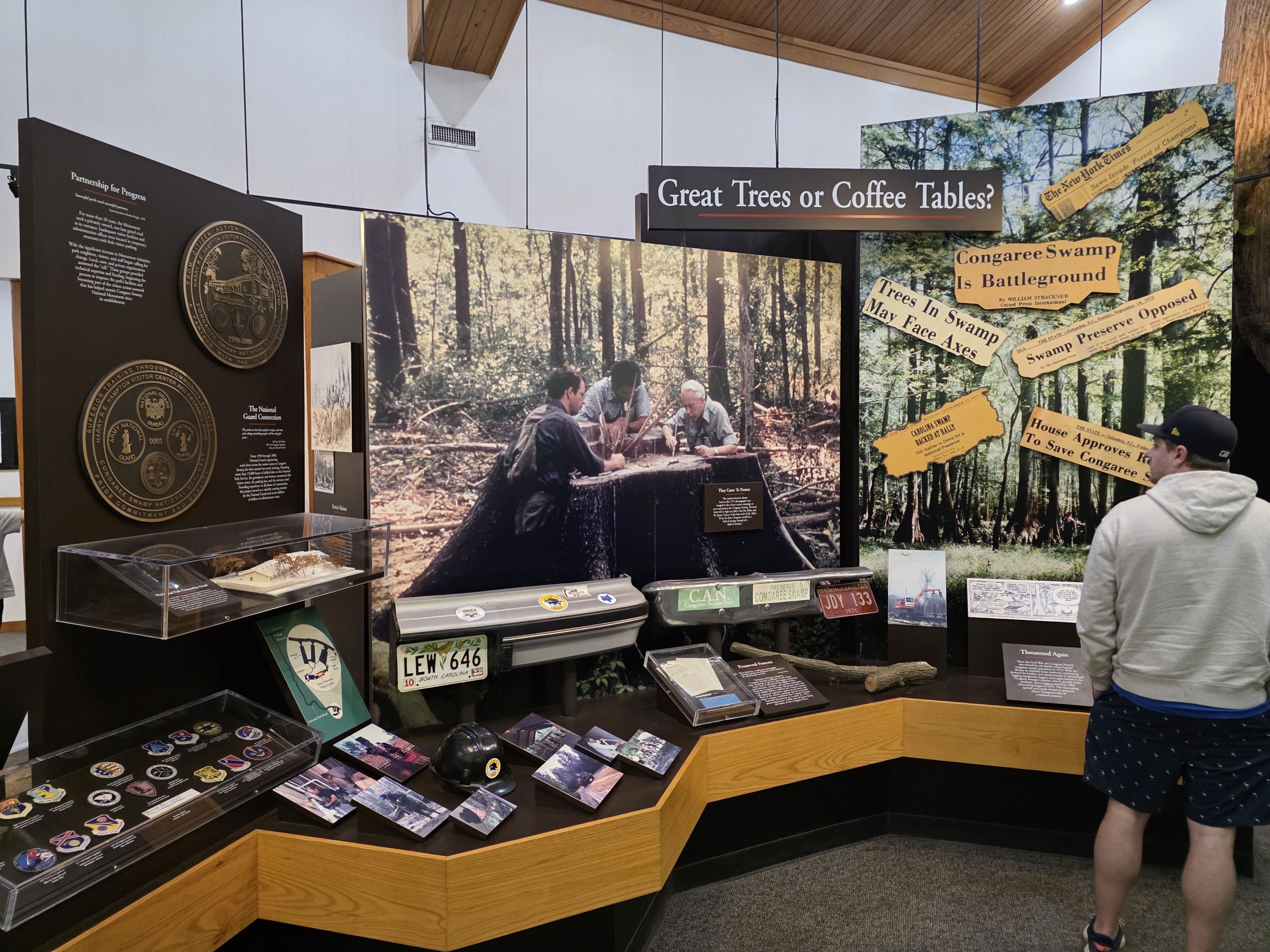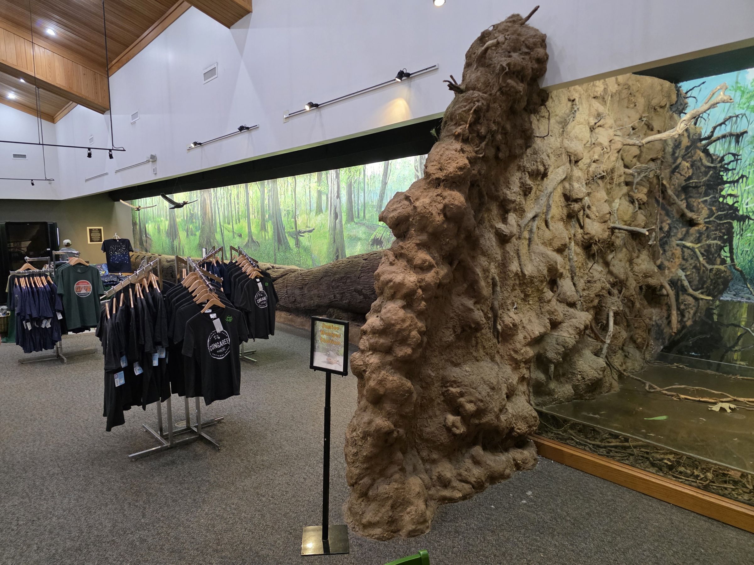 비지터센터 안에서 제일 먼저 눈에 띄는 것은 옆으로 쓰러져 있는 이 진짜 나무로 건물을 옆으로 길게 만든 이유가 다 있었다. 여기 온대 원시림의 늪지에서는 다양한 종류의 활엽수들이 최대 높이 50미터 가까이 자란다고 하며, 보통 건조한 땅에서 주로 자라는 소나무들도 습한 늪지에 적응하여 이례적으로 50미터가 넘는 나무들이 있다고 한다.